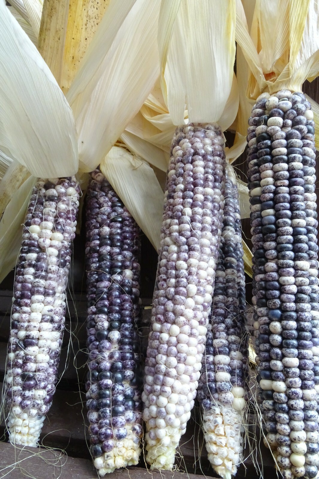 I grew this corn for the first time this year. It's a short corn with long cobs that appear to emerge almost at the base of the stalk. . The corn was traditionally grown in a small village near Tuba City, Arizona on the Navajo Reservation. It was dry-farmed, so the variety is very drought tolerant. The kernels are white and blue, speckled, and make a fine blue cornmeal. It is also very rare!
