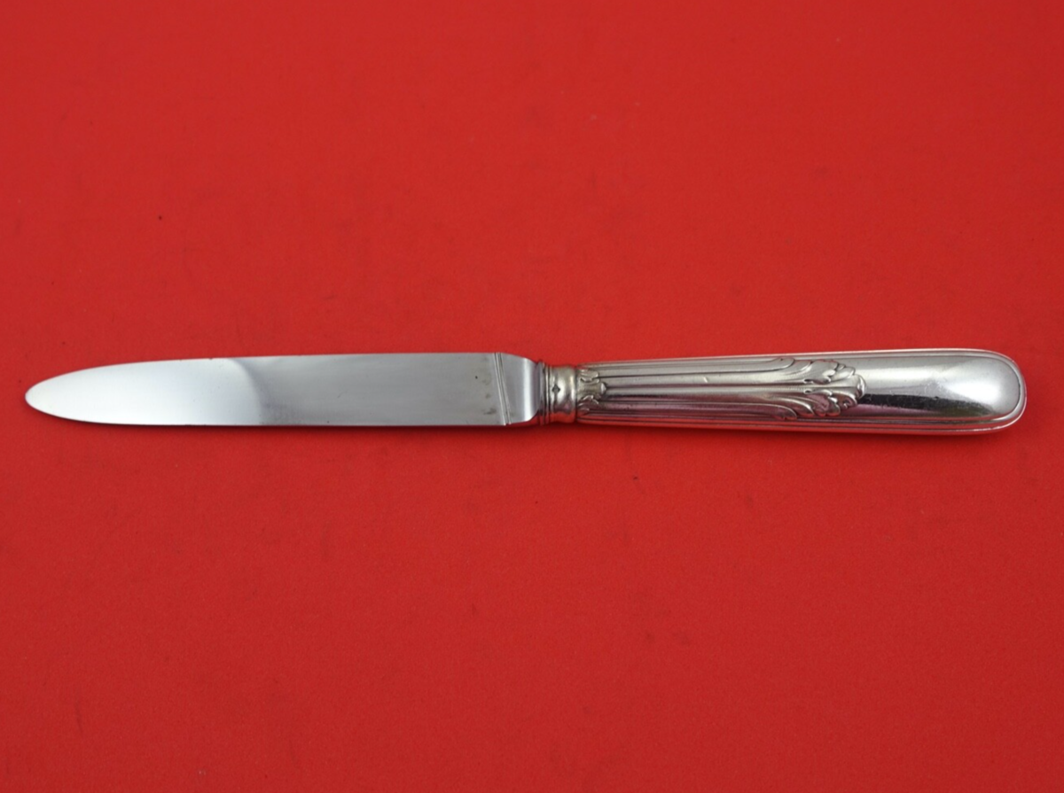 French .950 silver hollow handle Dessert Knife 7 7/8" in the pattern Rochambeau by Puiforcat. It is not monogrammed and is in good condition with minor blade imperfections.