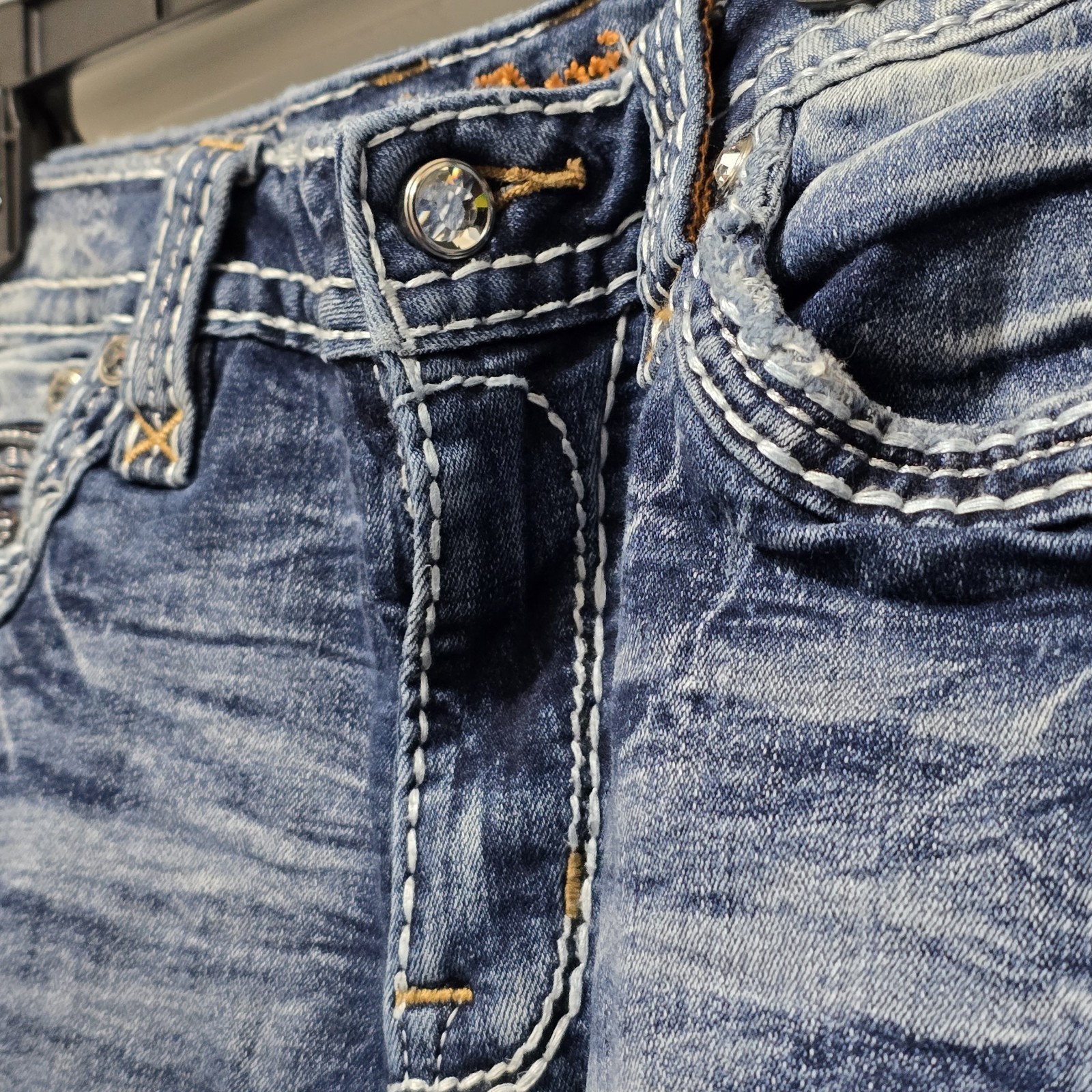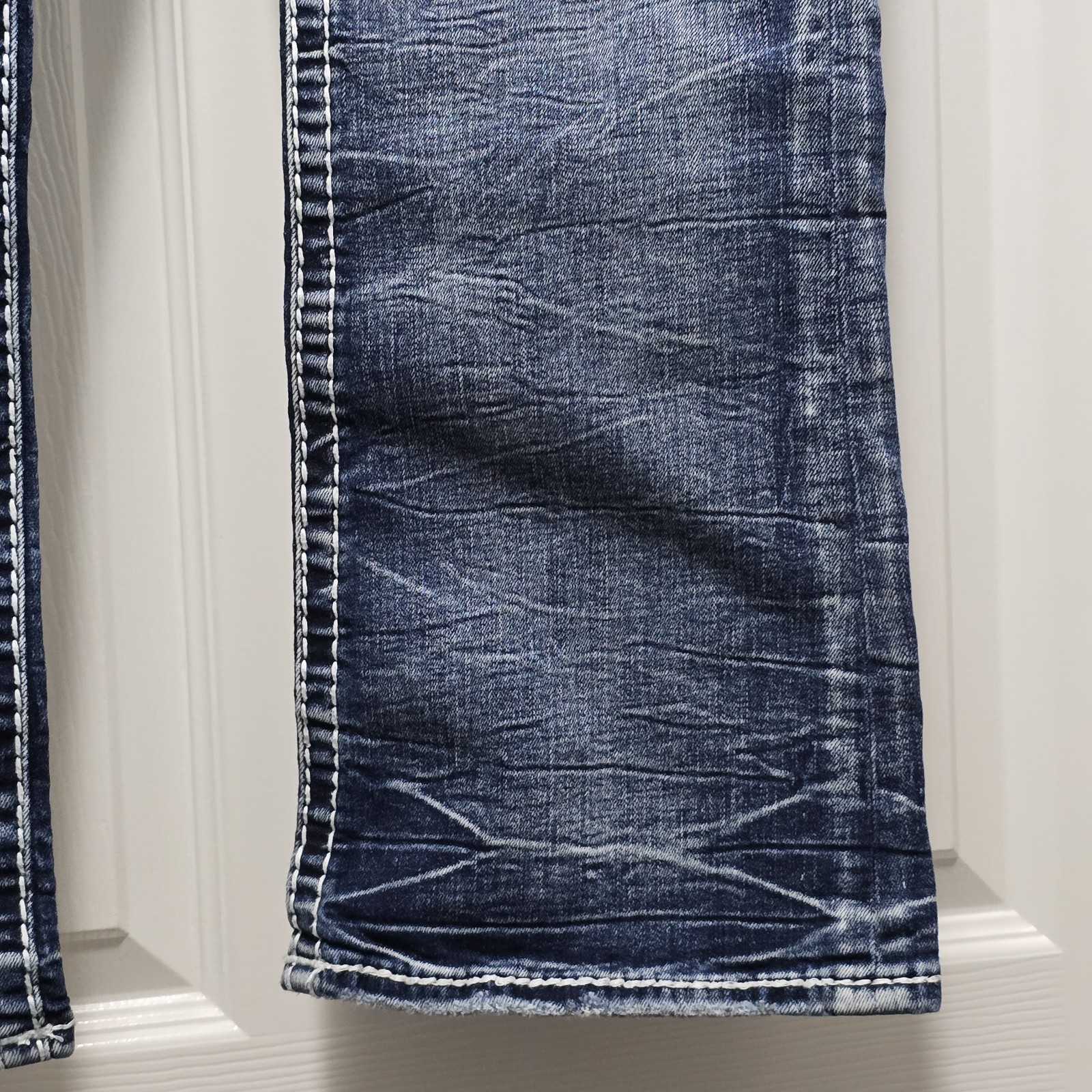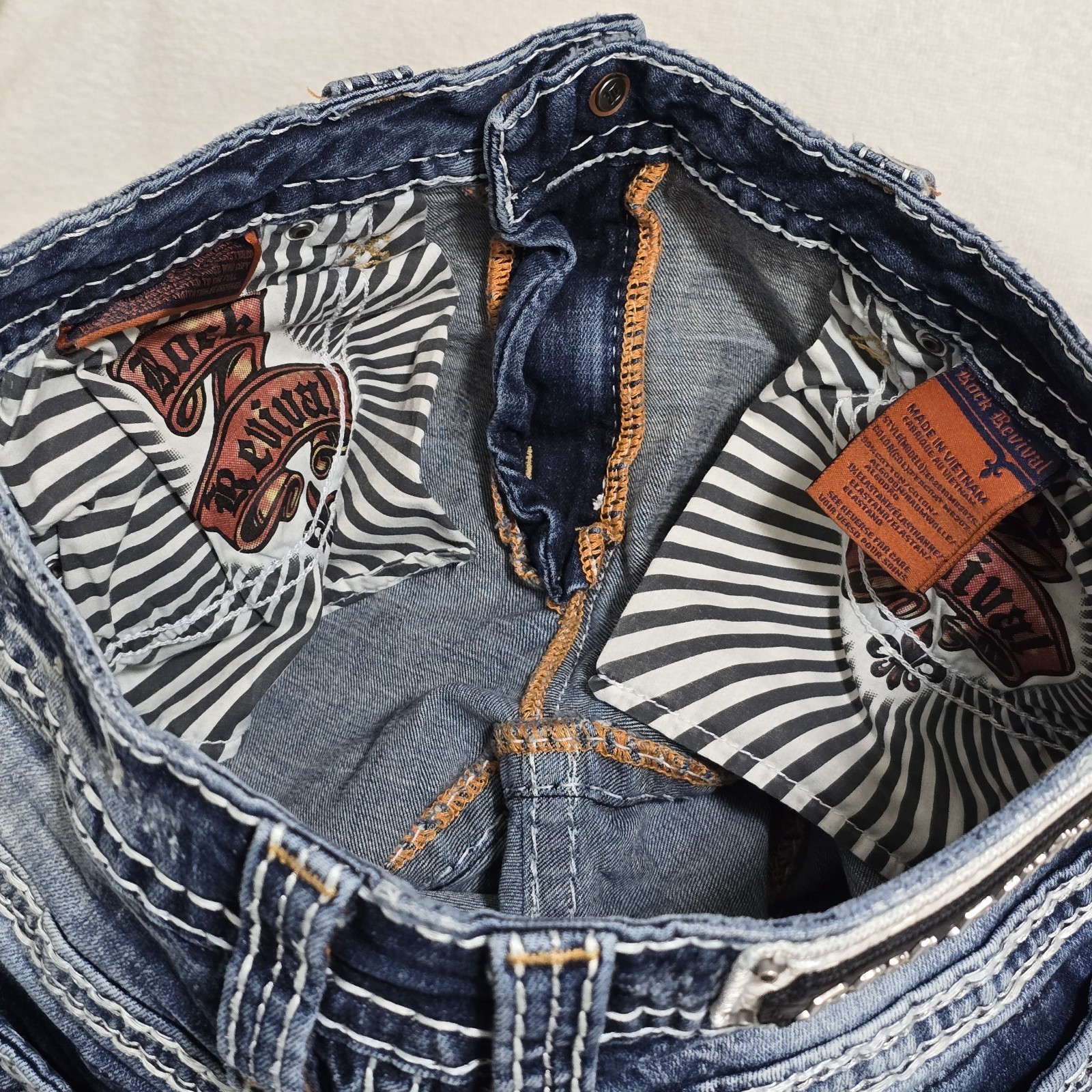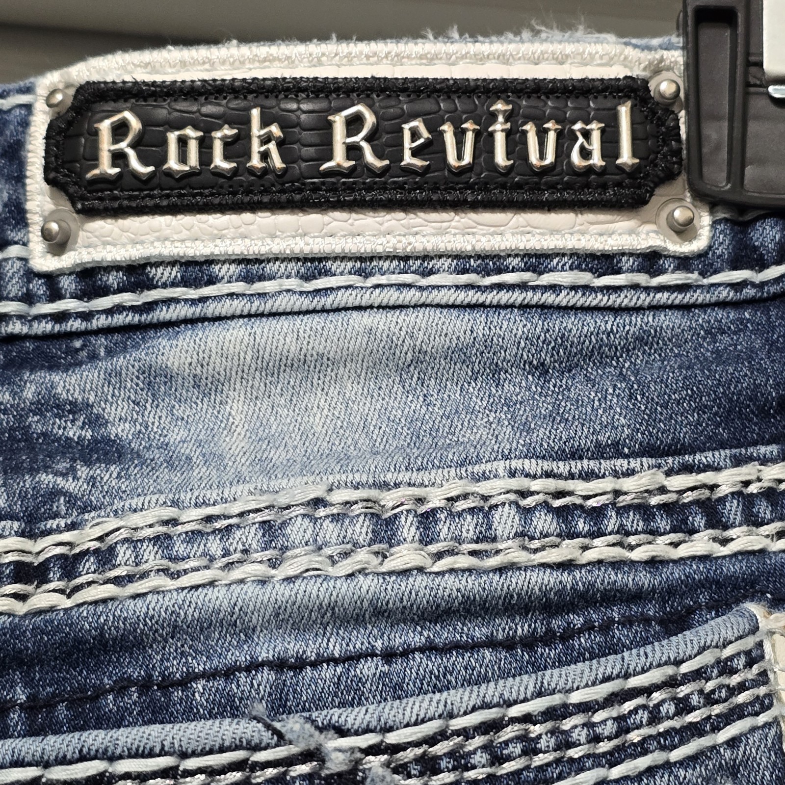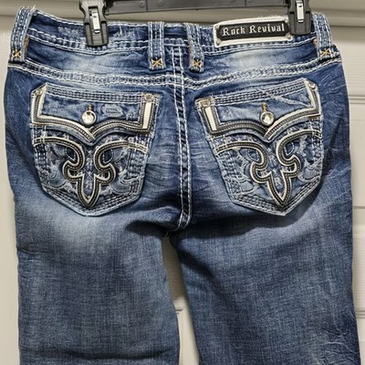 - Rock Revival Jeans PEACOAT Mid Rise Boot Rhinestones Metallic Stitch Women's 29