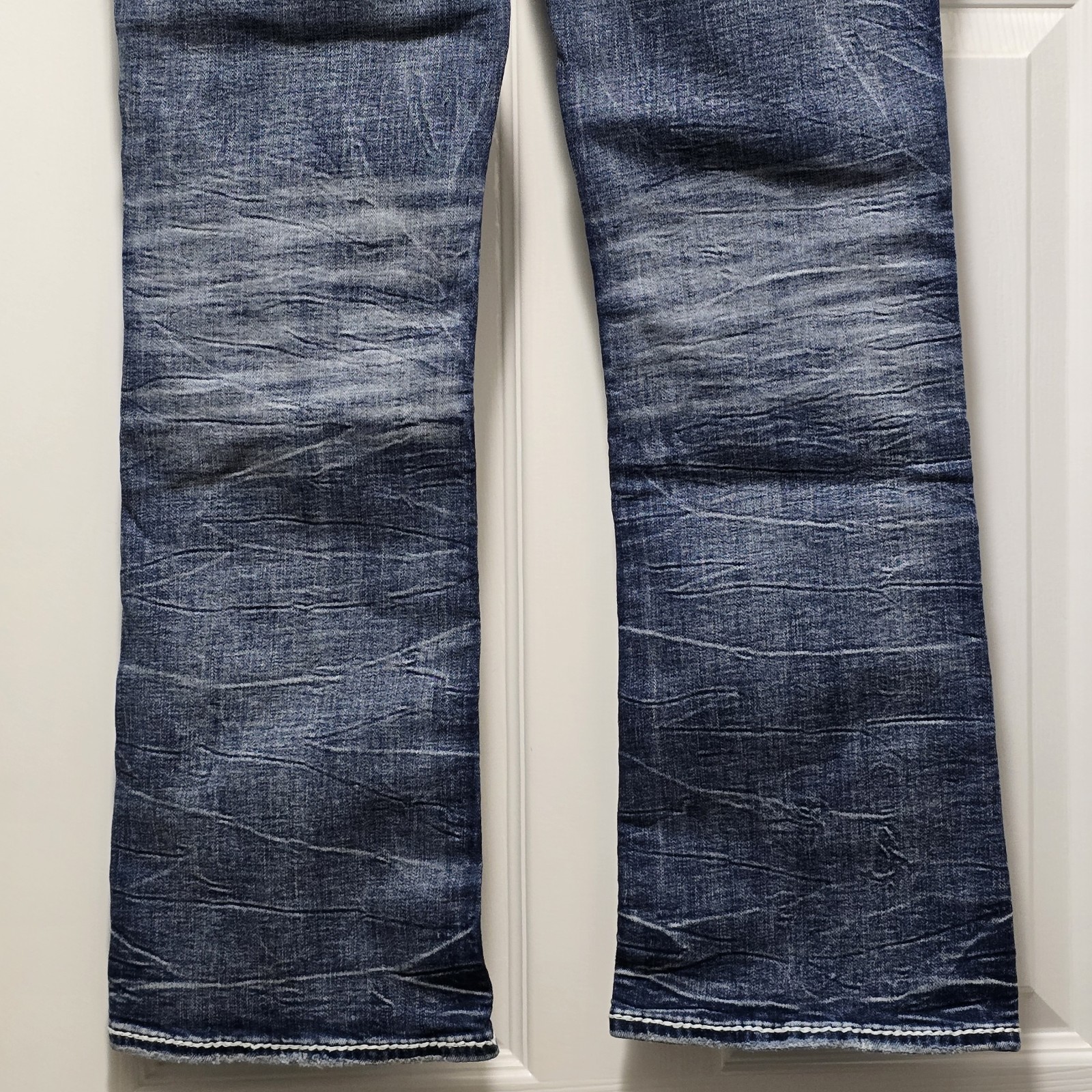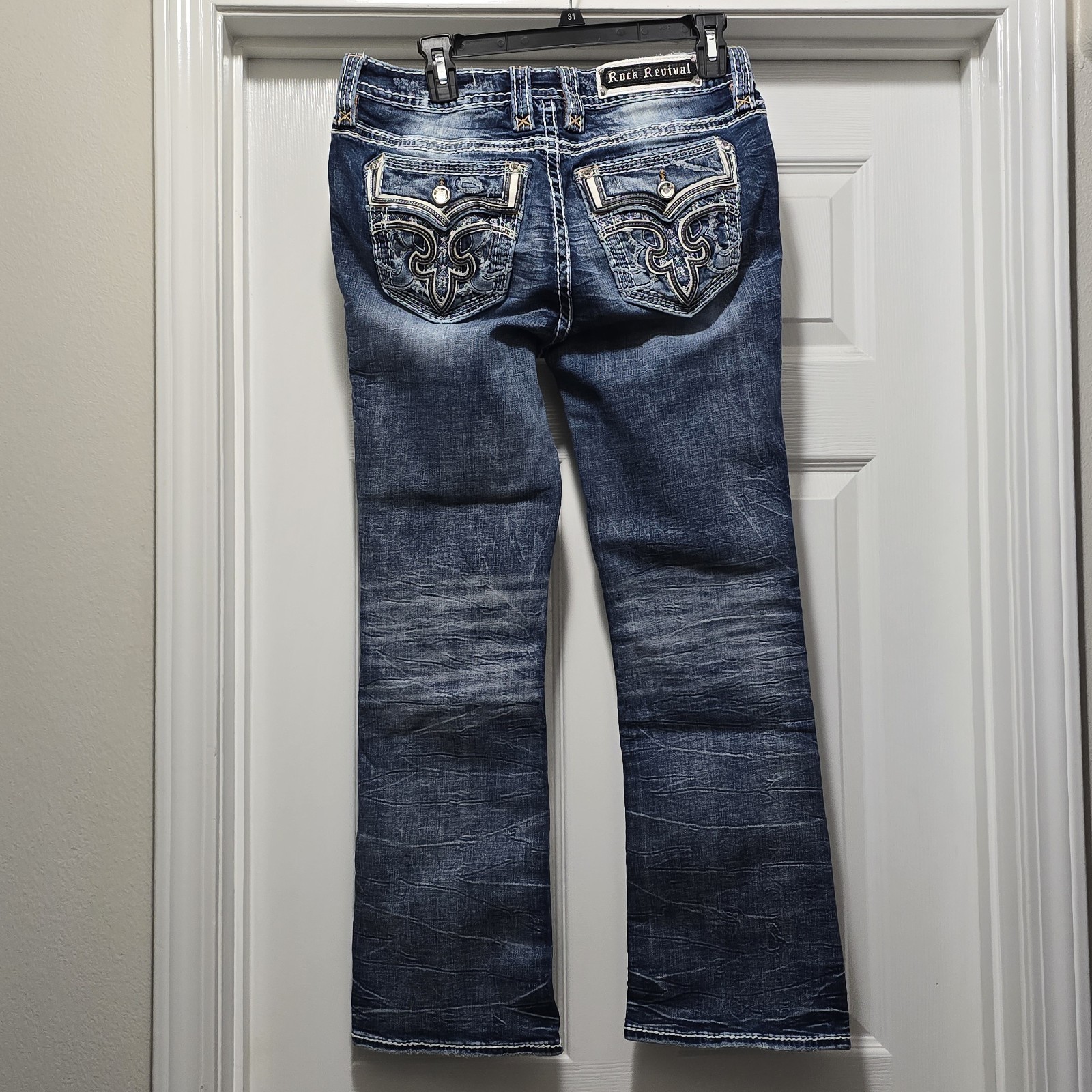 Like New Condition Rock Revival Jeans PEACOAT Mid Rise Boot Rhinestones Metallic Stitch Women's Size 29. Actual measurements: 32" waist, 29.5" inseam, 8.5" across ankle.