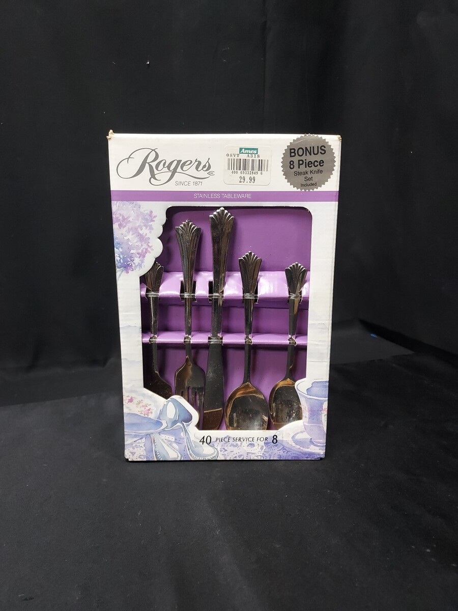 Rogers Stainless Steel Flatware 40 pc Service For Utensils Forks Knife Spoons. Condition is New. Shipped with USPS Ground Advantage.