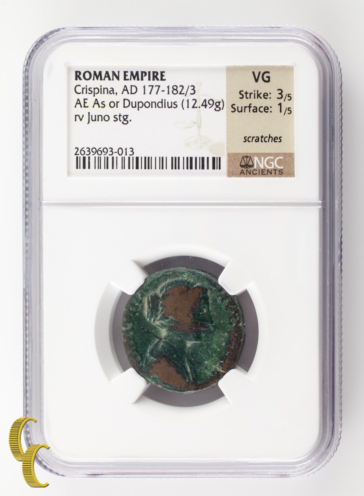 Roman Empire Crispina AD 177-182/3 Roman Empire Crispina AD 177-182/3 AE As or Dupondius (12.49 g) rv Juno stg. VG: Strike: 3/5 Surface: 1/5 *Please see photos for the actual item you are bidding on. *The customs requirements for each country, including all import duties, taxes, and fees are the responsibility of the buyer. All international packages will have the required customs declaration and value of order. California Buyers: 9.5% sales tax will be added. Returns Policy: About Us: If you have any questions, comments or concerns, please click "Ask a question" below, and we will respond as soon as possible. Thank you. Continental Coin and Jewelry Company Web Department: Monday ? Friday, from 10:30am ? 6:00pm PST Visit Our Store: Continental Coin and Jewelry Reference Item