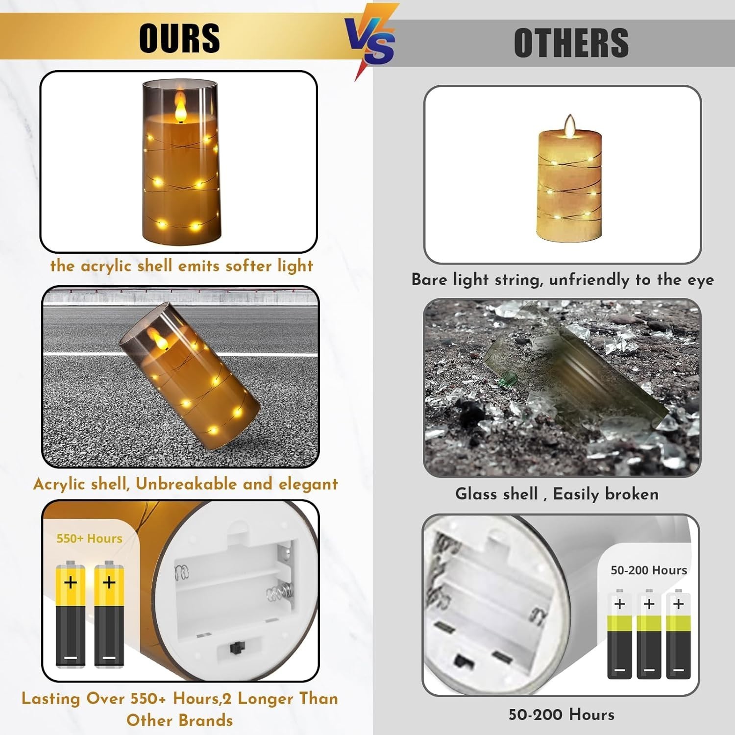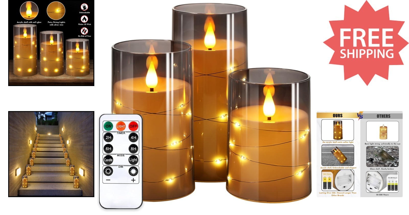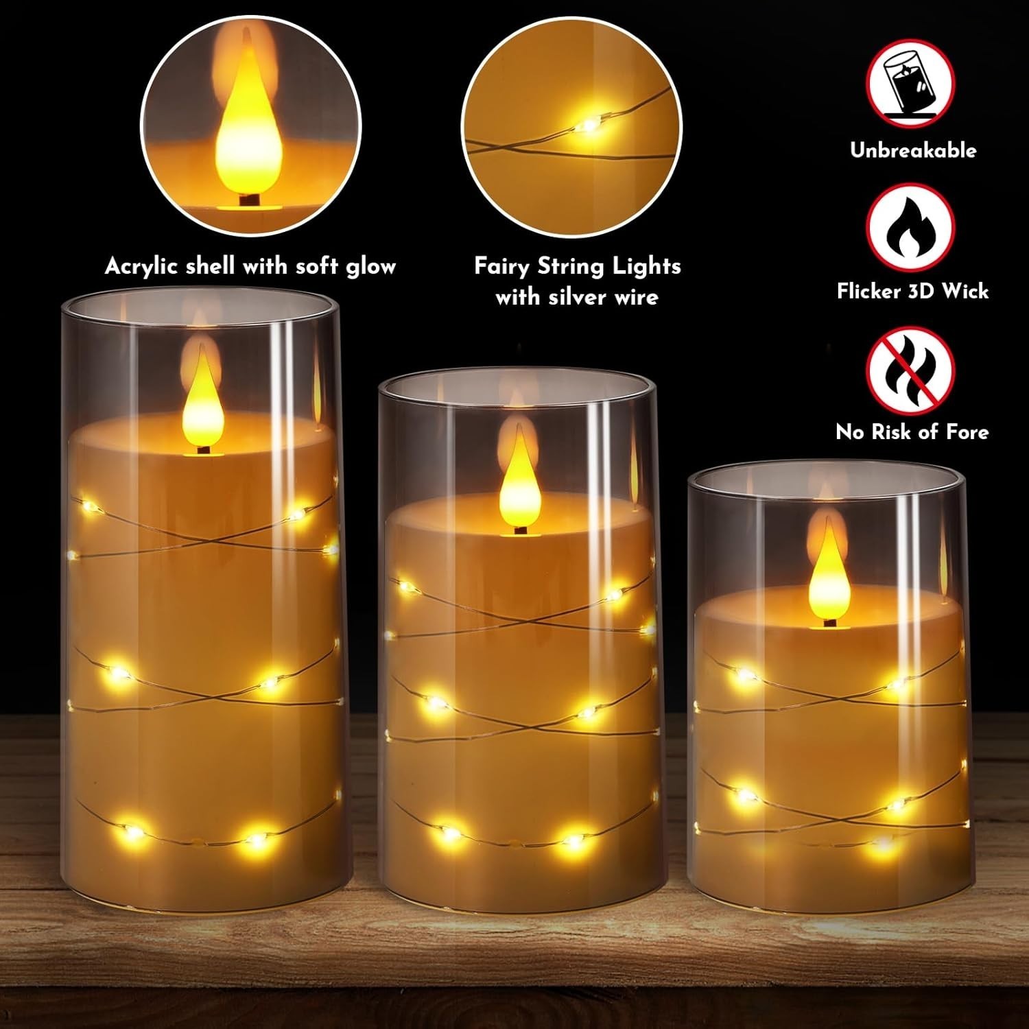 Features: LED,Remote and Timer,Built-in Star String Lights,Flickering,Battery Operated,Remote Control,Timer Function,Unbreakable Design,3D Wick,Realistic Appearance