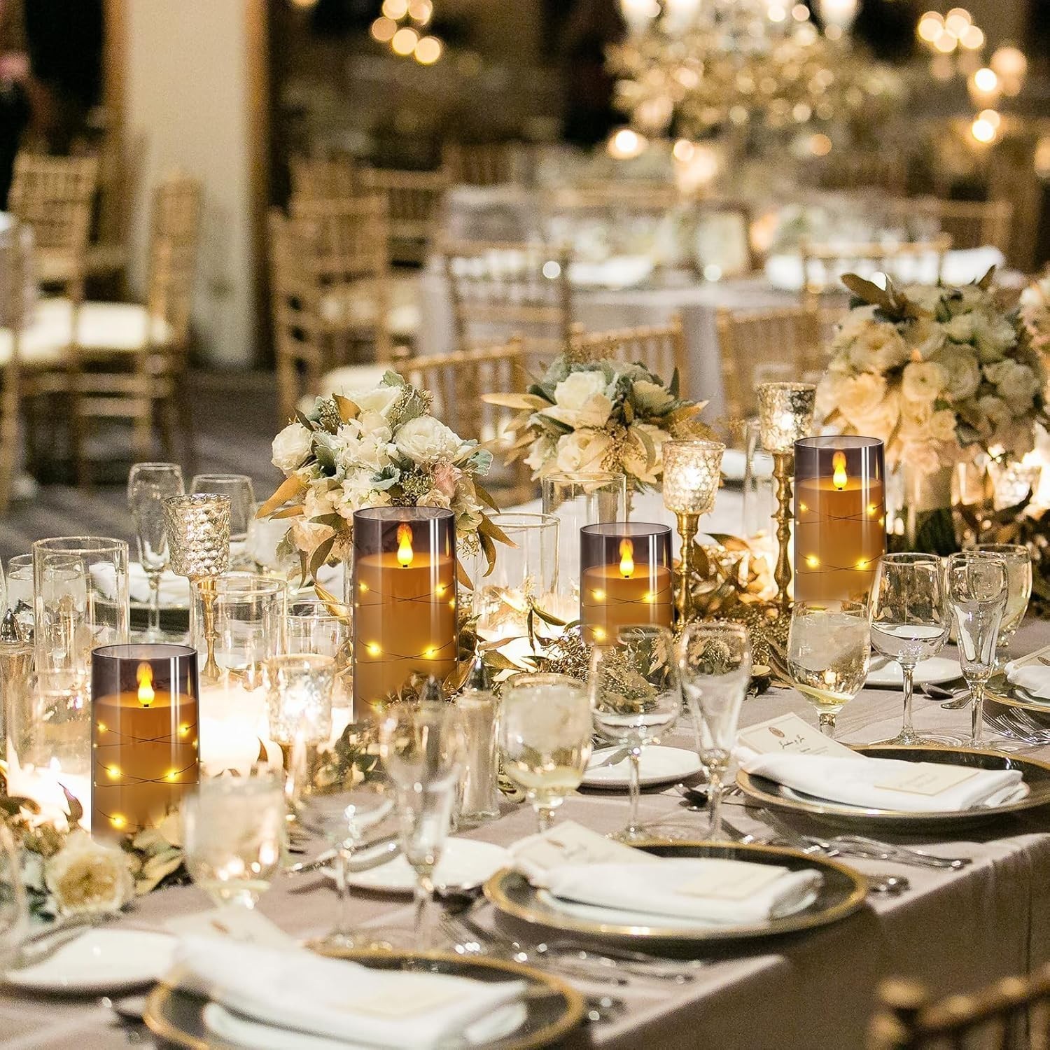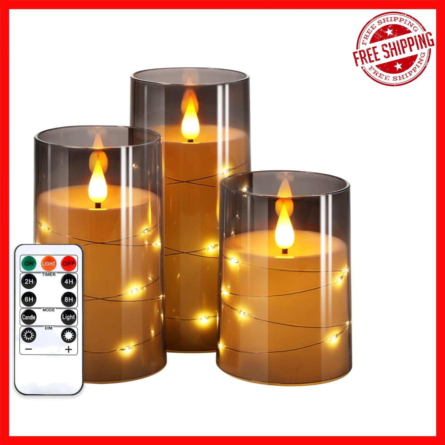 Experience enchanting ambiance with our Creative Embedded Starlight String Technology. This elegant silver metal wire features 16 warm LEDs that wind around a flameless acrylic pillar candle, creating a soft, mesmerizing glow without glare. The artistic design includes a 3D flickering wick for a realistic appearance, all housed in a durable, unbreakable shell that mimics real glass. Controlled via a convenient remote within 18 ft, you can easily switch modes, adjust brightness, and set timers for 2, 4, 6, or 8 hours, making it perfect for any occasion or setting. Suitable for home decor, parties, or gifts, these candles combine safety, beauty, and longevity. Each package includes three candles, a remote, and a user manual?batteries not included, but lasting over 500 hours of use.