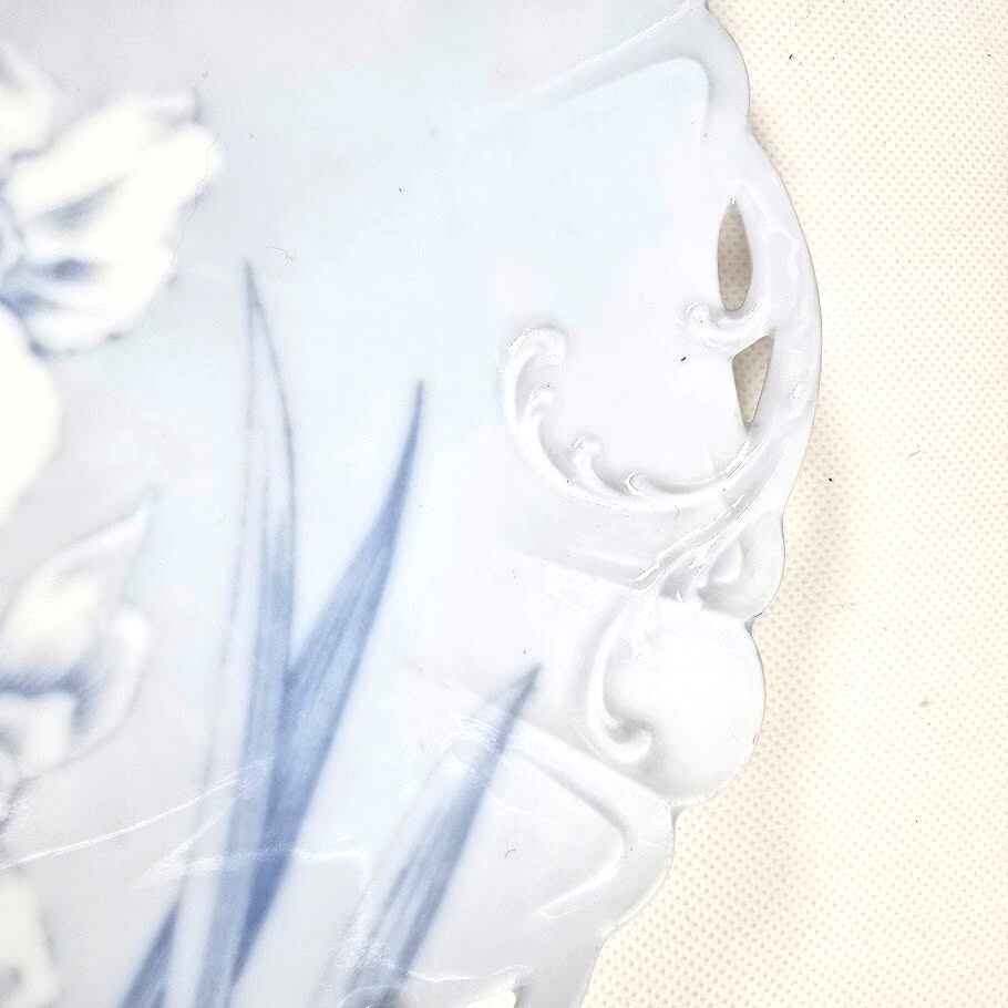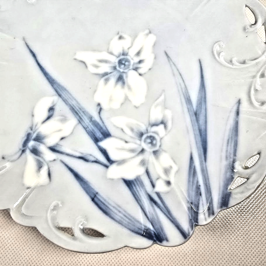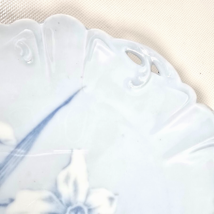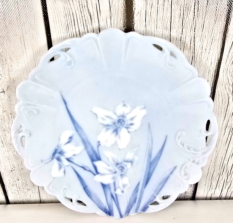 ? Reticulated rim with scalloped edge and delicate blue floral design