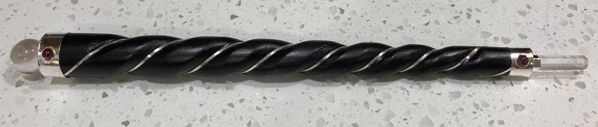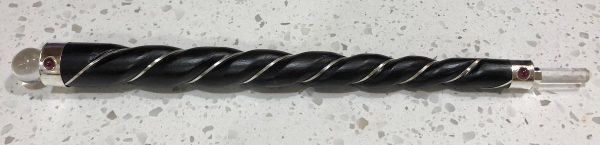A wonderful twisted rosewood healing wand capped at both ends with clear quartz crystal. The metal decoration includes a faux gem. Twist shape and length can vary but about 8 inches is typical.