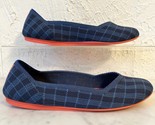Step into sustainable comfort with these stylish Rothy?s The Flat ballet shoes. Featuring an indigo blue and gingham plaid knit pattern with contrasting orange trim and outsoles, these flats combine eco-friendly materials with effortless style. Made from recycled plastic water bottles, Rothy?s signature knit is breathable, flexible, and machine washable ? perfect for everyday wear.