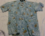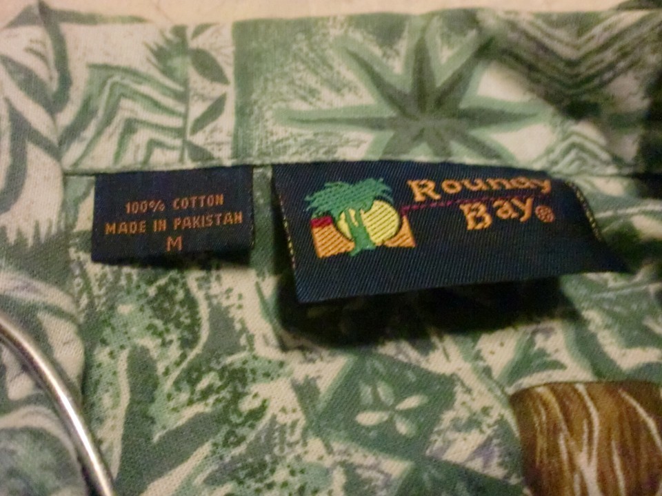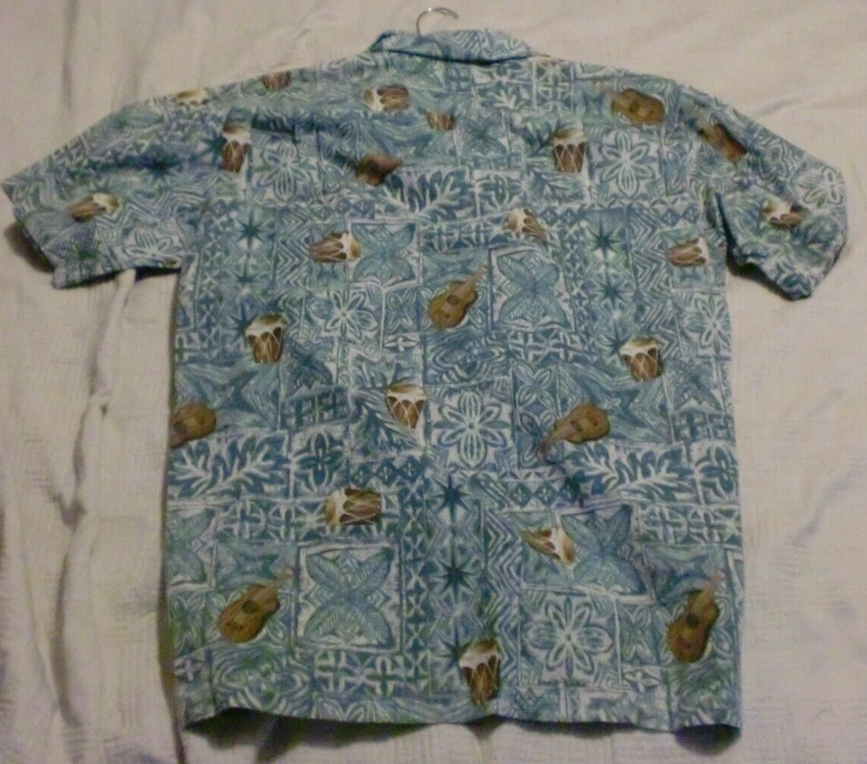 - Roundy Bay Hawaiian Shirt Mens M Button Up Cotton Tropical Guitars & Drums Tribe