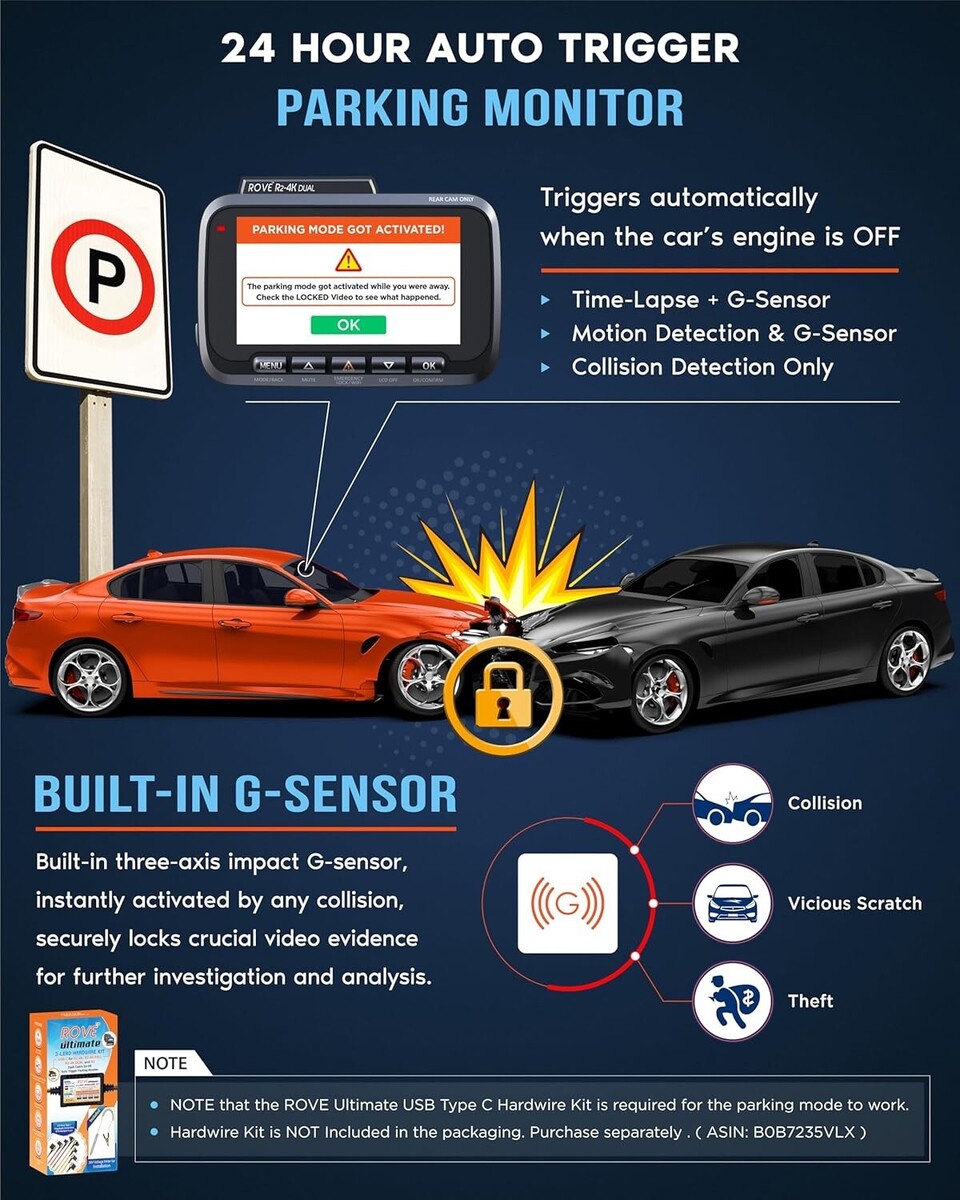 Our 24/7 CUSTOM DESIGNED PARKING MODE ? R2-4K DUAL offers three options for its custom-designed 24hr parking mode with voice guidance. 1fps timelapse video, motion detection, and collision detection. A hardwire kit is required (buy separately, ASIN: B0B7235VLX). If an event occurs in the park, then the camera will record a full 1-min video, lock it safely in an event folder, and give you a voice alert the next time you start your car letting you know that event has occurred while you were away.