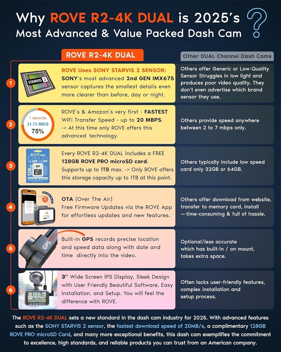 - ROVE R2-4K DUAL Dash Cam Front and Rear, STARVIS 2 Sensor, FREE 128GB Card Inclu