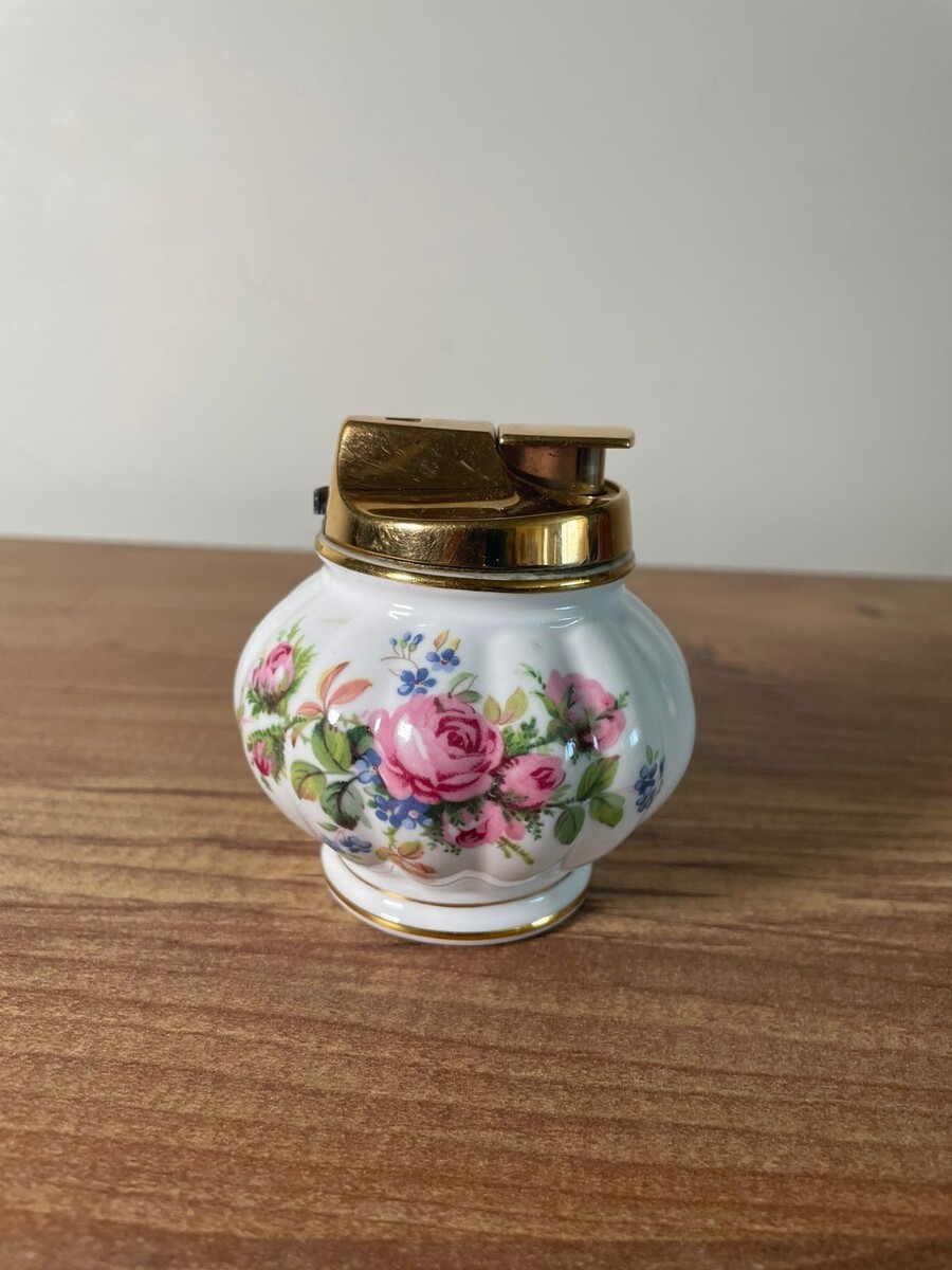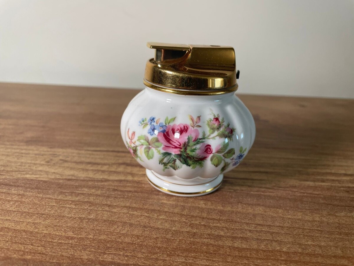 The lighter is in excellent condition, with no chips, cracks or crazing to the bone china. It is functional, and a new flint was installed, just add your lighter fluid by slipping the lighter out of the ceramic holder.