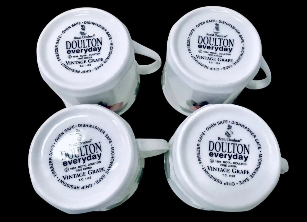 Royal Doulton 1994 Everyday Fine China Vintage Grape Pattern Set Of 2 Cups Saucers Set TC1193 Discontinued. Measurements for cup 3" Tall, 4 1/4" Handle to Rim, Saucer 6" Wide. These cups saucers are made in England, are "Everyday 1994 Fine China". They are freezer safe, oven microwave safe and dishwasher safe.They are marked on the bottoms. They are in excellent clean condition with no chips or cracks. Light utensil marks. Same or next business day USPS Shipping.