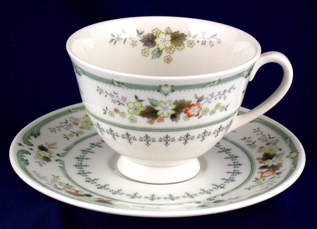 Royal Doulton Provencal cup and saucer, pattern no. TC1034. The saucer is 6-1/8 inches in diameter while the footed cup is 3-7/8 inches in diameter and 2-3/4 inches tall. This pattern was discontinued in 1997. This set is in new condition.