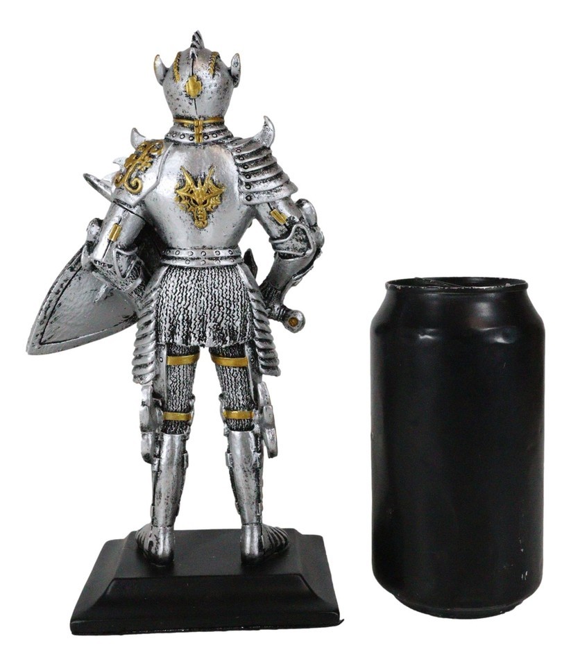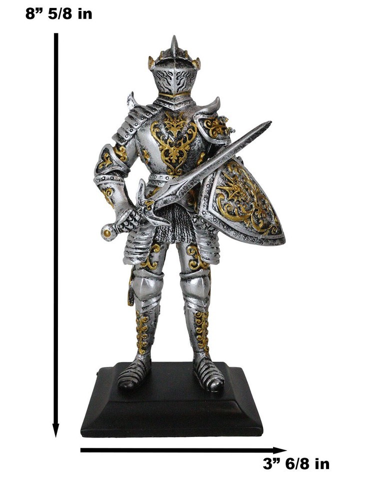 ? This Dragon Medieval Knight Figurine measures 8.5" tall, 3.75" wide and 3" deep approximately. It weighs about 1 pound.