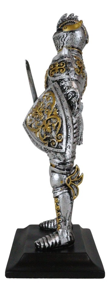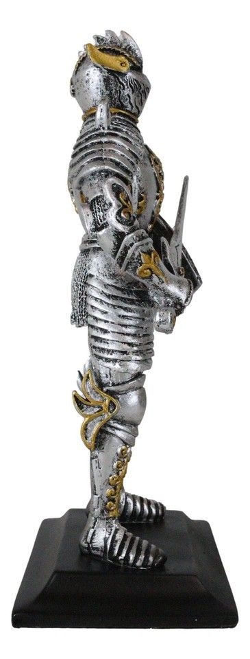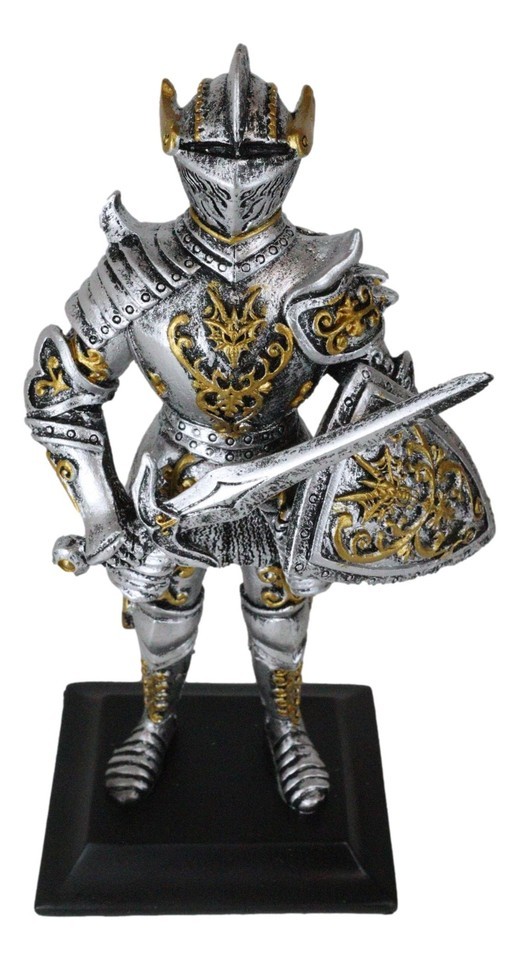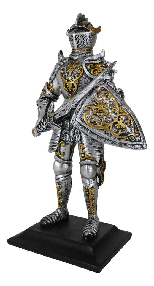 ? Decorate your home with this gorgeous chivalrous knight statue. He is fully armored, standing on guard with a long sword and large heraldry dragon emblem shield. He will make a great gift to any medieval knight, crusader knights and renaissance art lovers.