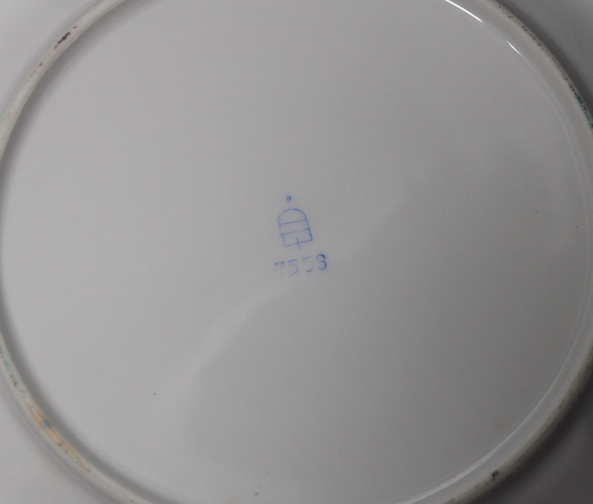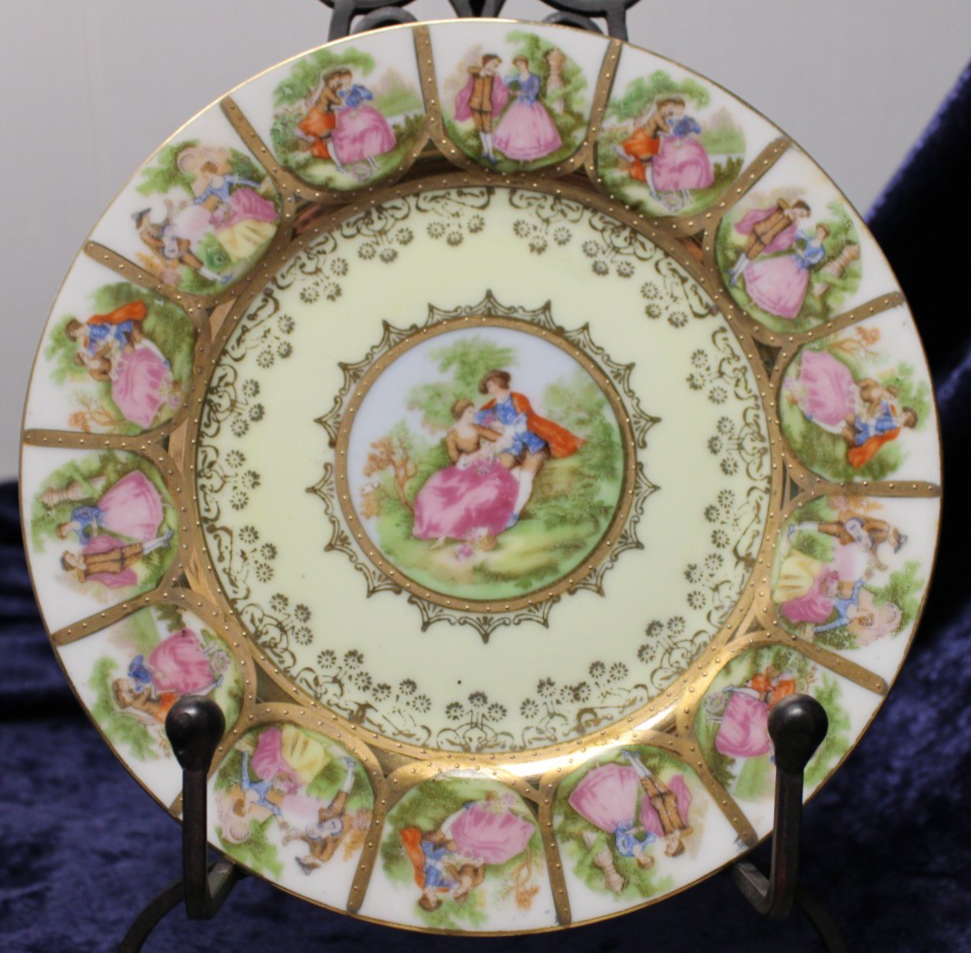 Royal Vienna, in Austria originally manufactured this design but went out of business in 1864. They used the Beehive mark (actually the inverted Royal Vienna shield). Arnart, in Japan, re-registered the design in 1957. The design is referred to as "Fragonard" which actually refers to the original 'artist' of the design from the 1800's. These are used in good condition.