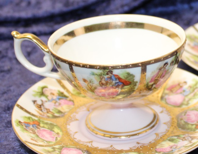Royal Vienna originally manufactured this design but went out of business in 1864. They used the Beehive mark (actually the inverted Royal Vienna shield). Arnart, in Japan, re-registered the design in 1957. The design is referred to as "Fragonard" which refers to the original 'artist' of the design from the 1800's. These are used in good condition.