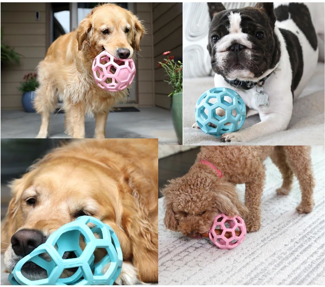 Product description: Rubber Roller Dog Toy Treat Hole Stuffer Brain Stimulating Challenge Puzzle Ball Our Rubber Roller is a fun, versatile puzzle dog toy that lets dogs play in multiple ways! Made from durable soft, stretchy natural rubber, the open ball features a unique open design that makes it easy to stuff a dog's favorite treats, kibble, other small toys, ice cubes, or whatever else you can think of to create mentally challenging puzzle experience for dogs. As a dog works to remove treats of different shapes and sizes from the Rubber Roller they develop problem-solving skills and increase their mental abilities. Natural rubber is gentle on a dog's gums as they chew and teethe. Available in a variety of sizes, the Rubber Roller can be used as a training aid or for fetch, toss, tugging, chew toy and puzzle treat time. A versatile toy for dogs of different ages and breeds. Stuff with treats or small toys. Keeps bored dogs occupied. Provides mental stimulation. Made from durable natural rubber. Gentle on your dog's mouth. Available in pink or blue. Small = 3" / Medium = 4.5" / Large = 5"