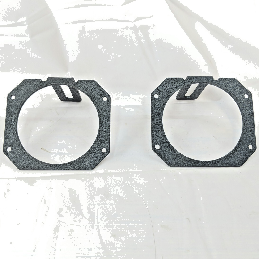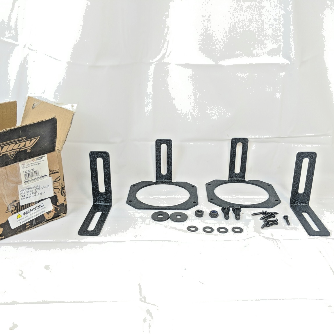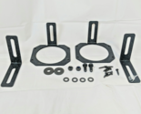 Exact item set is shown. New open box complete kit with original packaging in fair condition. Includes the mounting hardware shown. Allows mounting of 3.5" round or 3" cube LED lights in OEM or Rugged Ridge bumper systems (XHD and All-Terrain.) Made in China. No returns on installed items or partial sets. Please review our business policies in our store for information regarding returns, shipping and warranties.