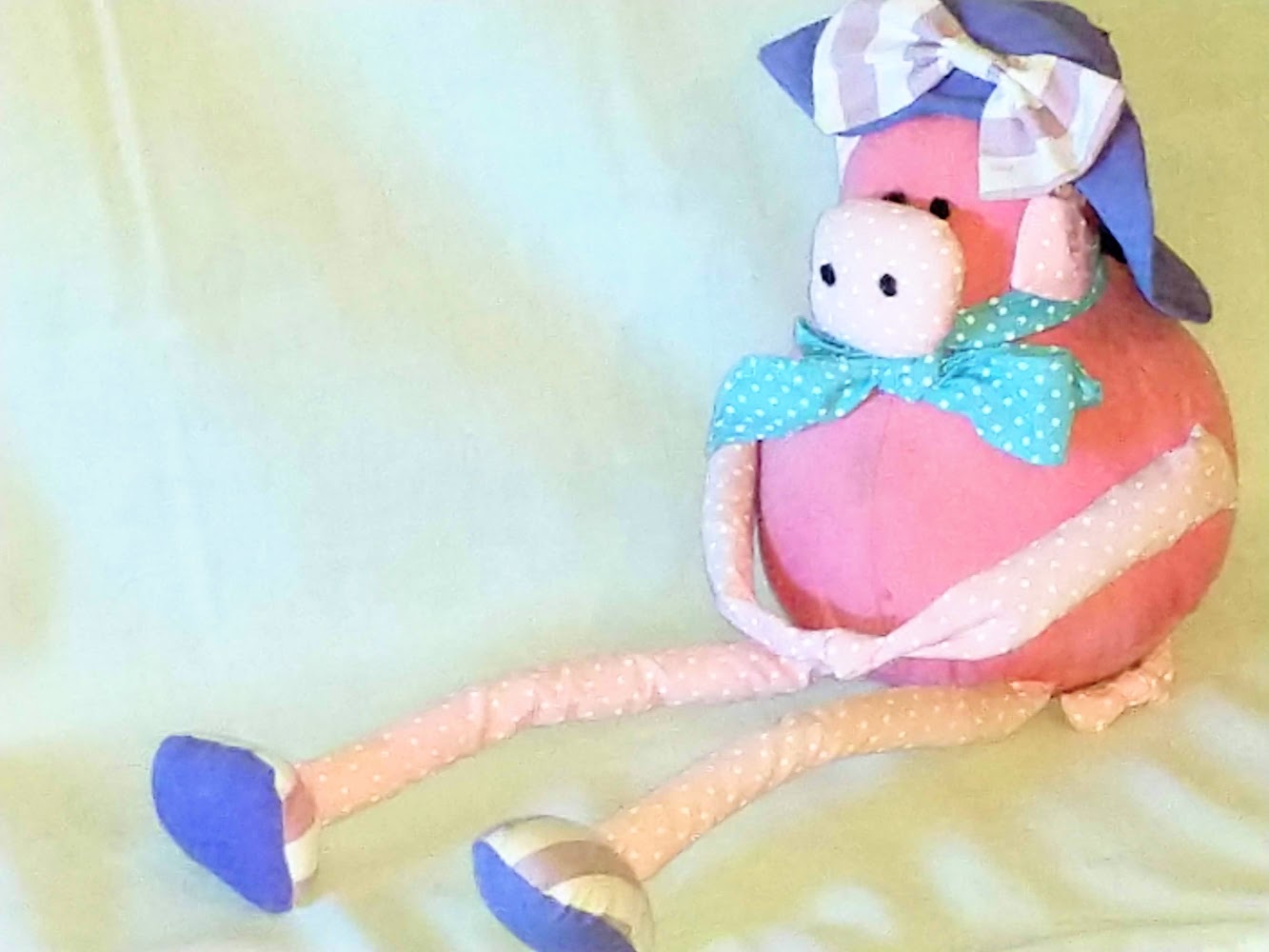 This Stuffed Animal Lady Pig in Pink fabric with a blue bonnet, a polka dot bow and blue slippers has a plump stiff body for sitting upright, with long legs and arms for posing is from the Russ Berrie Co UK Ltd collection