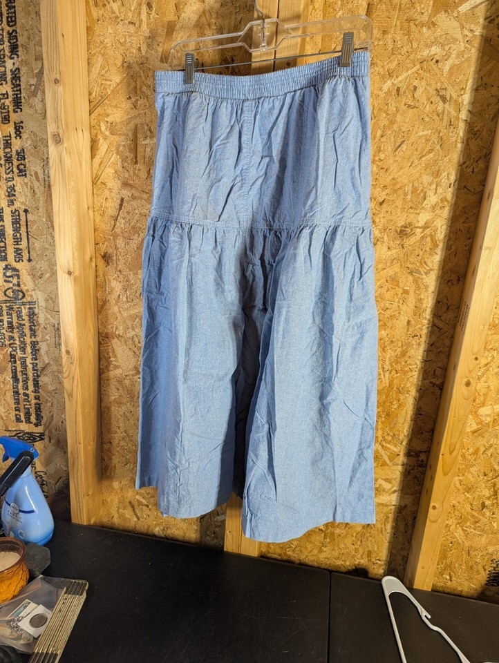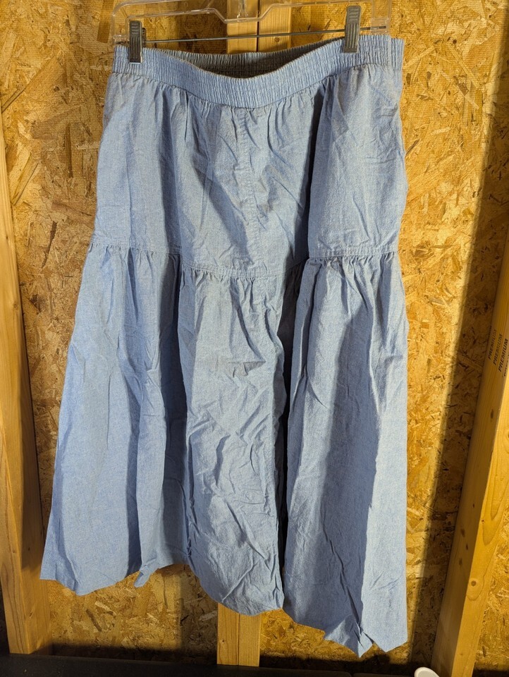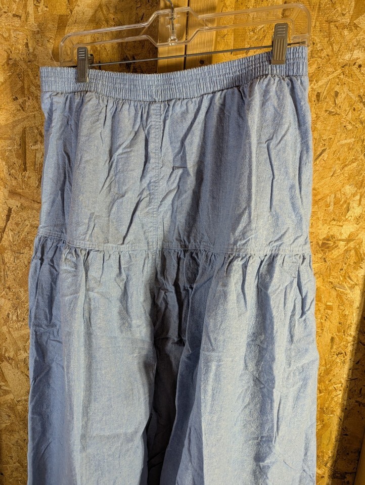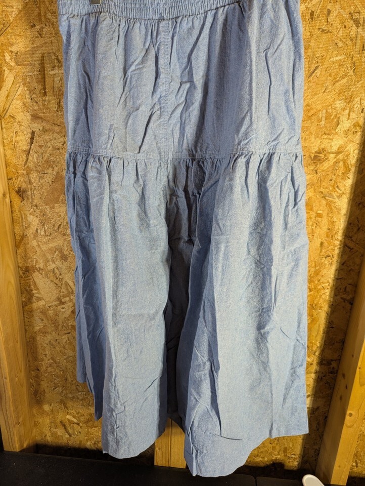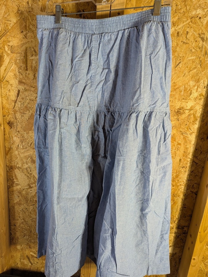 The Russ Studio Denim Size 18 Skirt is a vintage-inspired peasant-style skirt made from cotton denim in a solid blue color. This long skirt features an elastic waist for comfort and stretch, along with pockets for added functionality. Perfect for various occasions such as travel, party/cocktail, and casual wear, this skirt is machine washable and suitable for all seasons, making it a versatile addition to any woman's wardrobe. Made in the United States, this size 18 skirt from Russ Studio is a stylish and practical choice for plus-size women looking for a timeless piece. 30" waist and 41" length