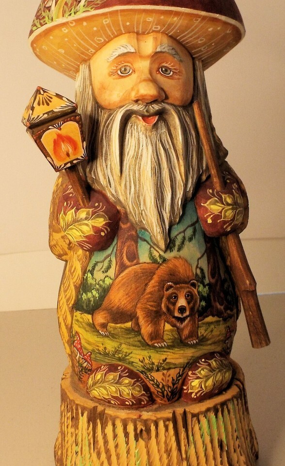 - Russian Hand Carved & Painted Gnome Standing On Wood Stump "Grizzly Bear"- sh...