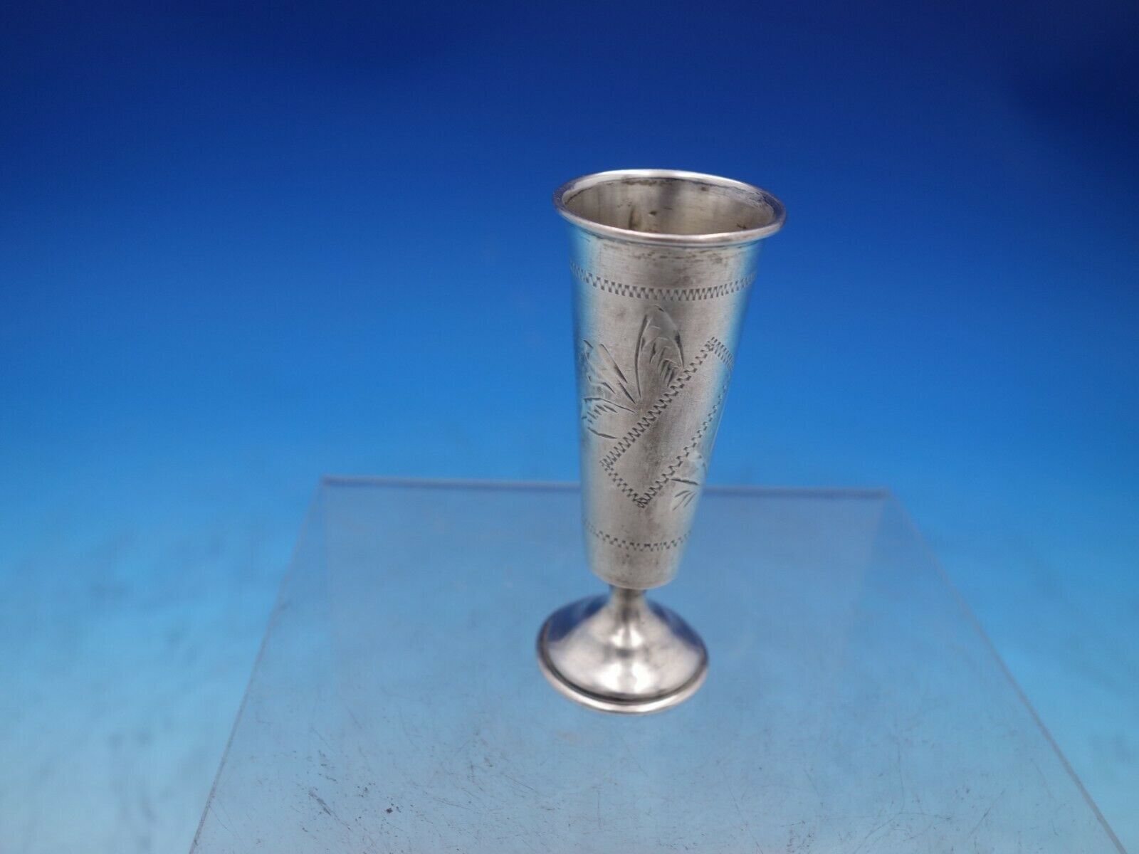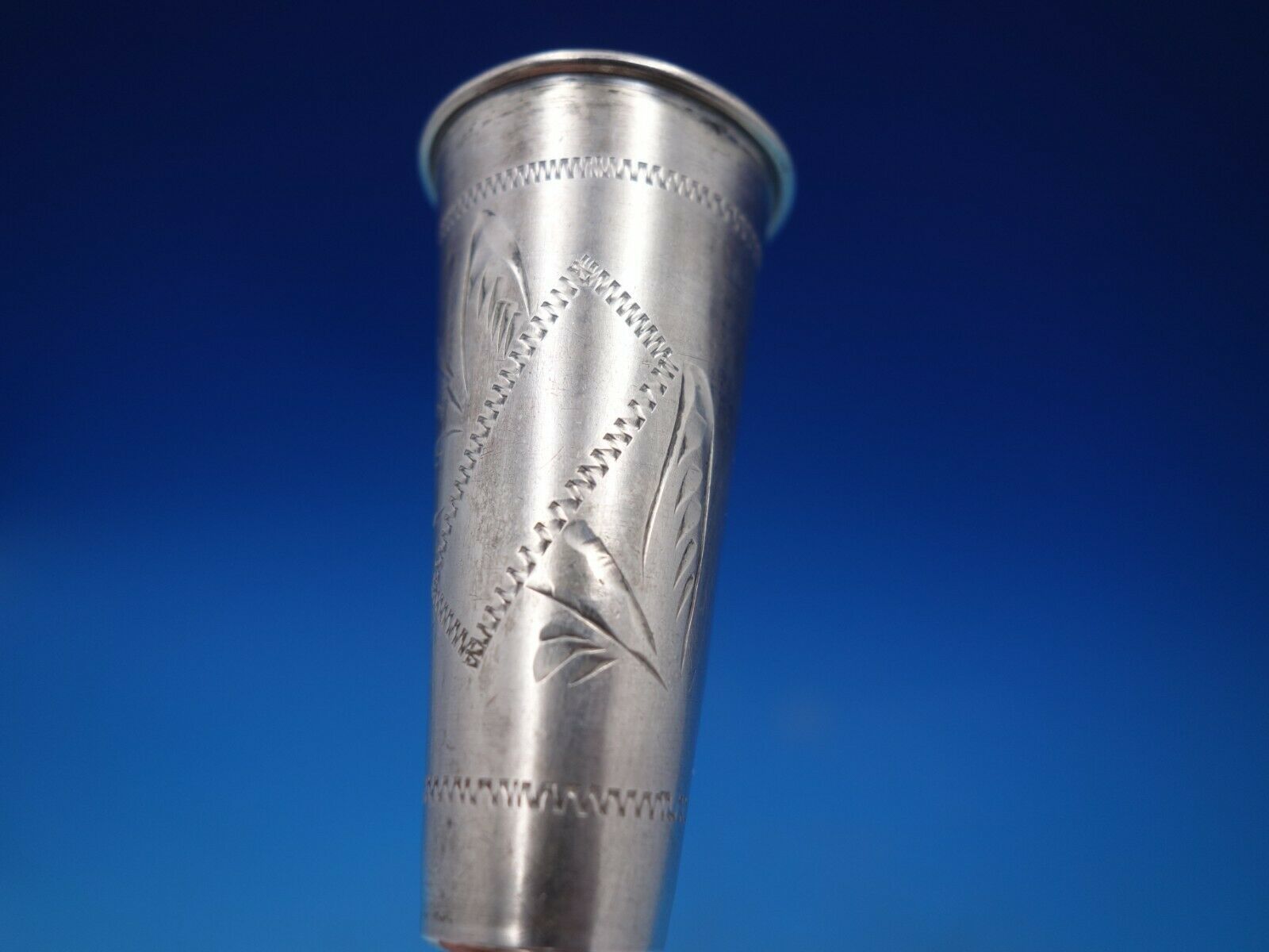 Wonderful Russian silver cordial cup with engraved detailing, marked #84 (maker unknown). This piece measures 3" tall x 1 1/8" in diameter and weighs 0.8 troy ounces. It is not monogrammed and is in good vintage condition. Marvelous piece!
