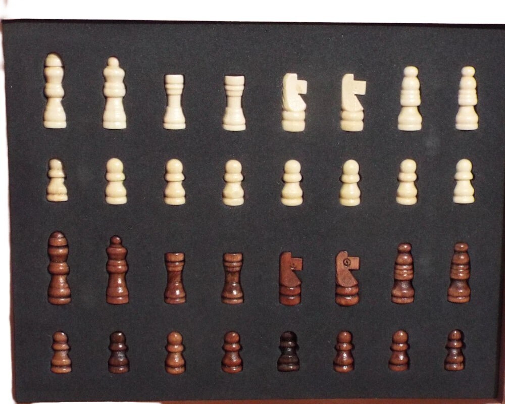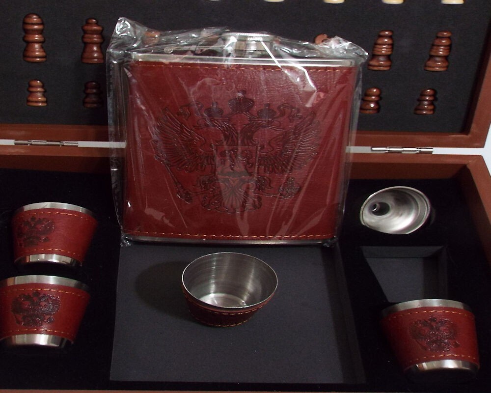 Russian Chess set hand made by a Russian Artisan. The set has a nice wooden box with a latch when you open it has 4 shot cups, and a flask. The chess pieces are made from wood and on top of the board there is board to play chess when the box is closed.