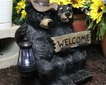 Rustic Black Bear Couple By Bench With Welcome Sign LED Lantern Garden Statue