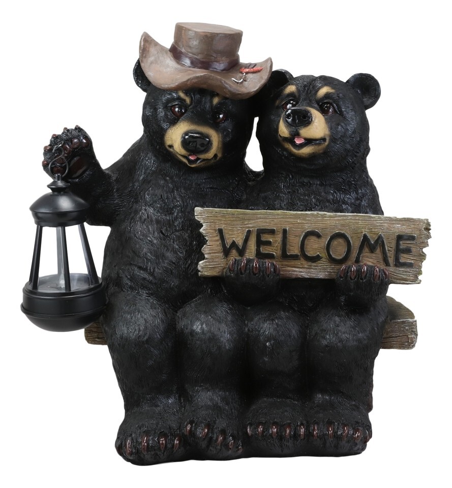 - Rustic Black Bear Couple By Bench With Welcome Sign & LED Lantern Garden Statue
