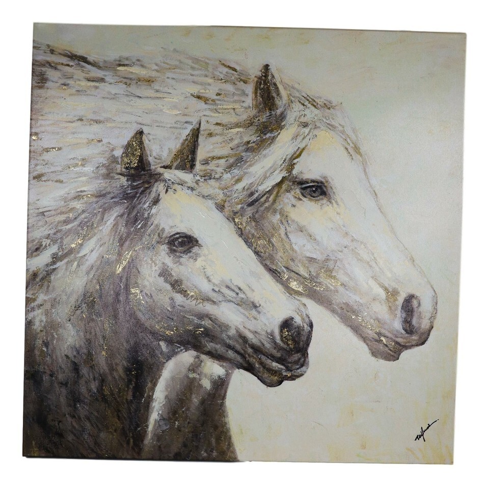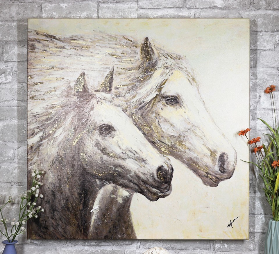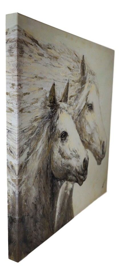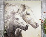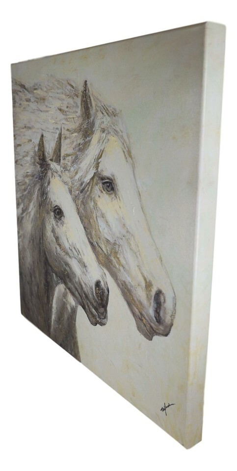 ? A handsome portrait of 2 running horses detailed in varying shades of white and beige. This equine piece is wonderful for those who appreciate a classic rustic style and has a heart for nature.