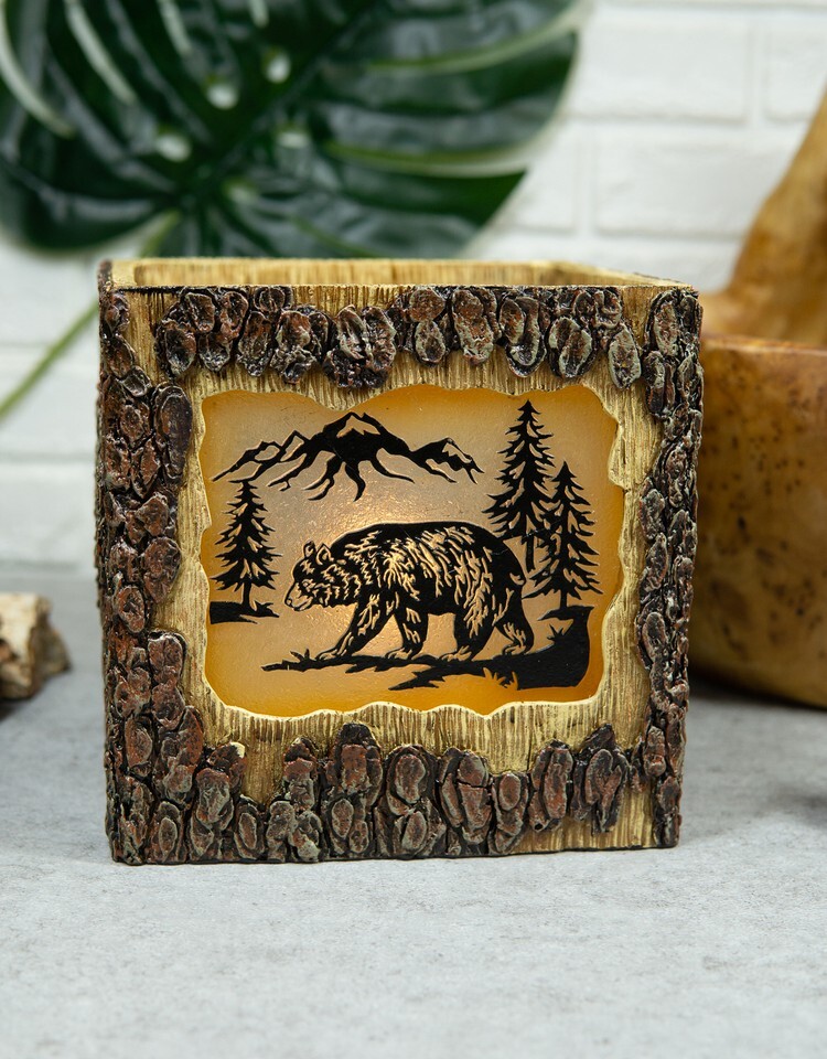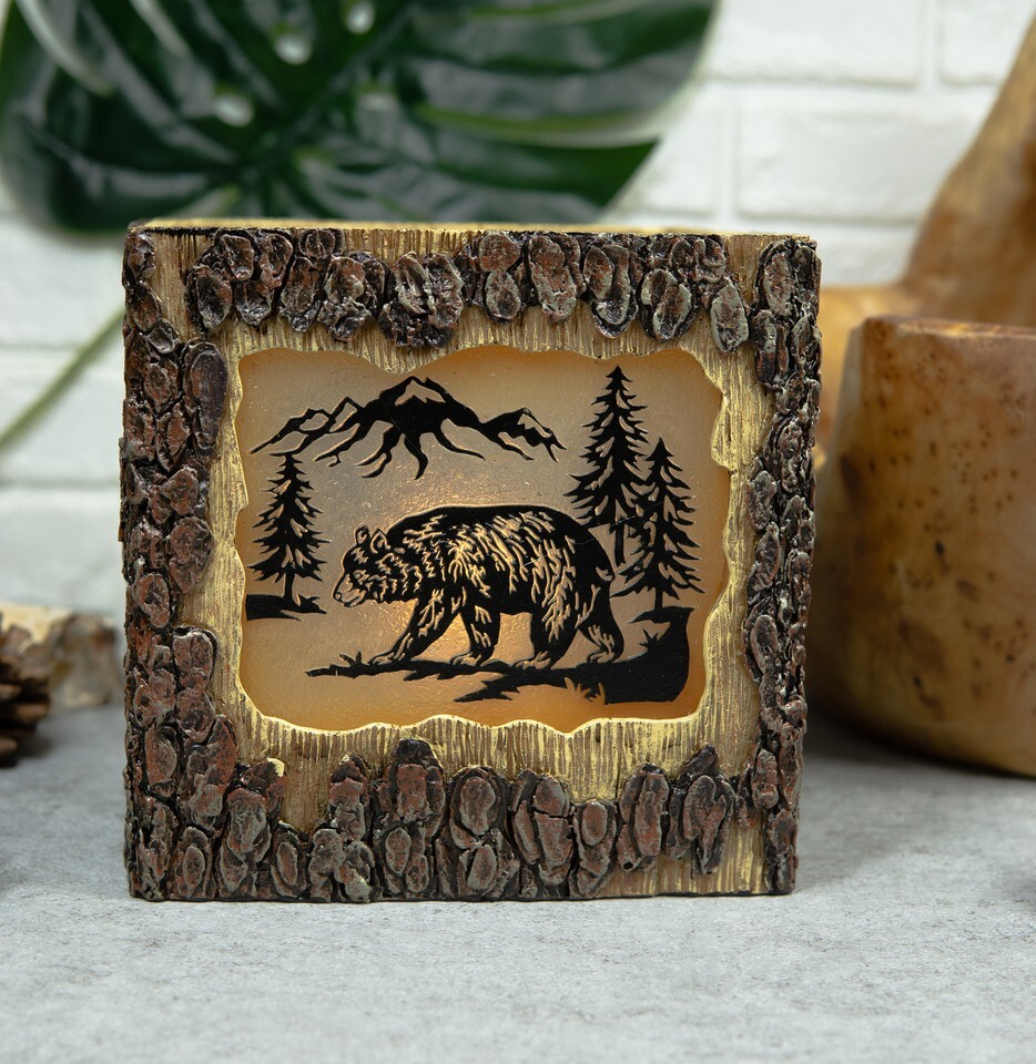 ? These accent lights make a homey, cozy atmosphere, whether you are snuggling by the fire in a cabin, or enjoying the comforts of home. We start off with the light frame made of resin but sculpted and designed to resemble carved tree trunk bark. On two of the panels on the square shaped sculpture are silhouettes of the animal of choice in their environment.