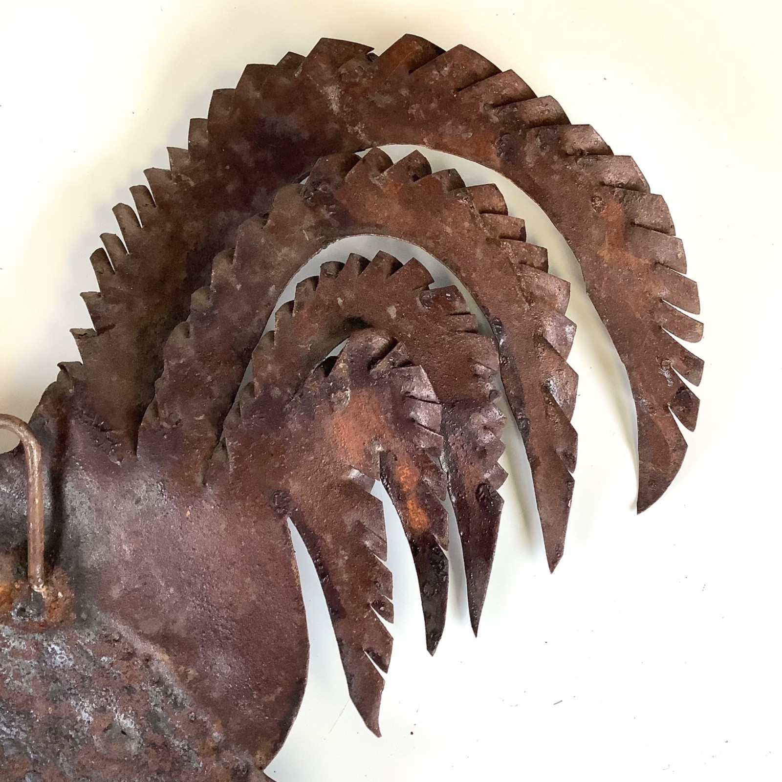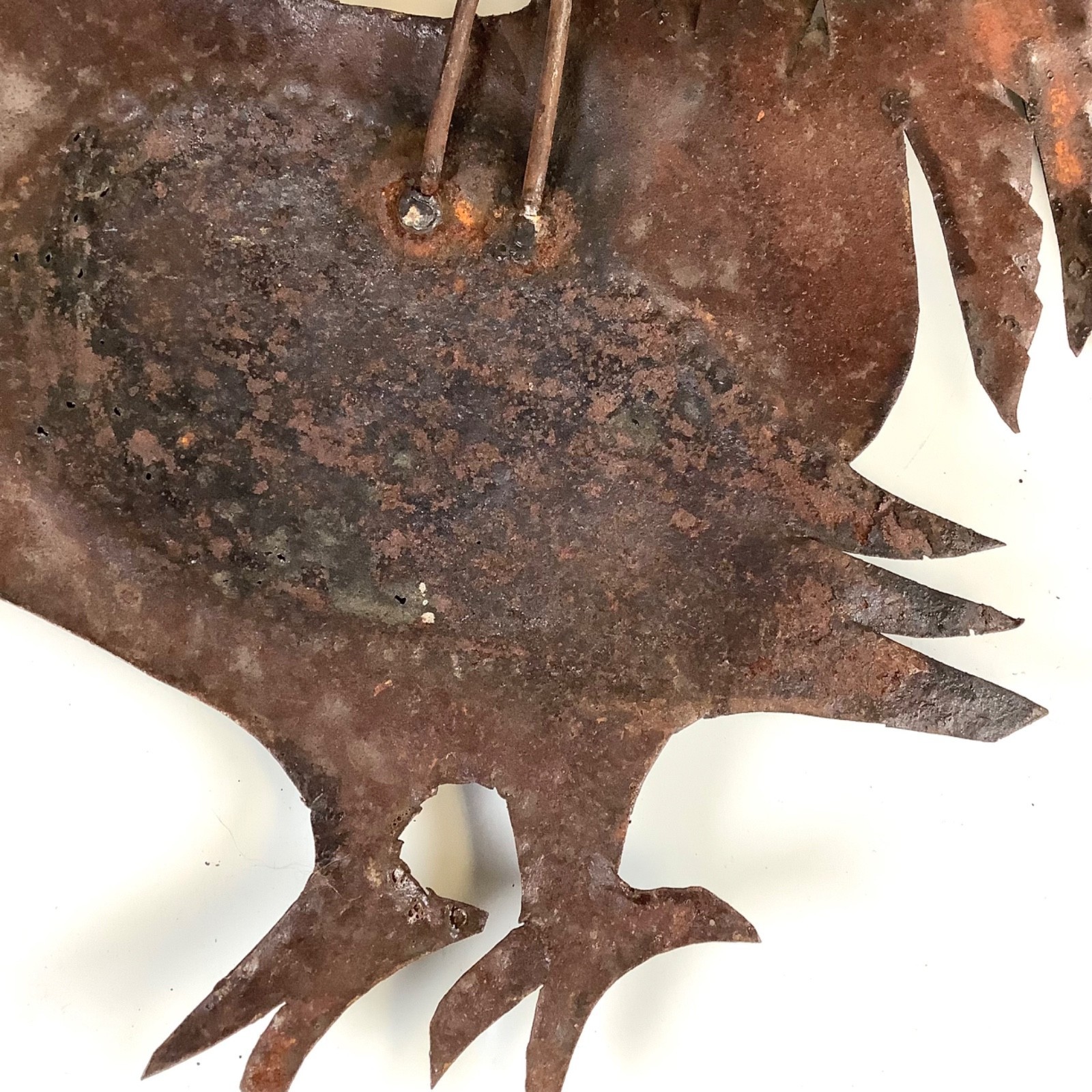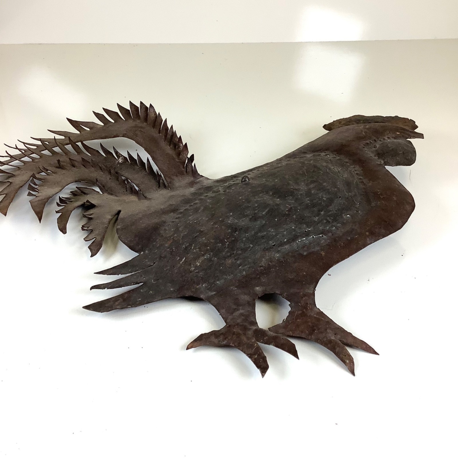 Rustic Primitive Farmhouse Metal Rooster Wall Hanger Chicken 15?W Handmade. Shows wear and age but overall good condition. Measures approximately 15.5 inches wide by 13 inches high. Please see all photos.