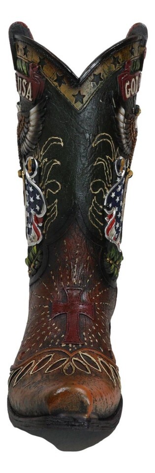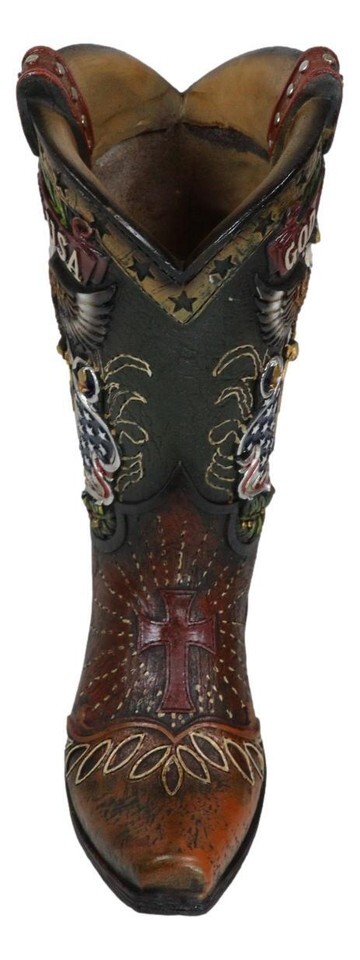 ? Add some flair to your home with this awesome vase/tabletop accent. Intricately detailed, the cowboy boot features the majestic bald eagle, cross plaque crest and the words God Bless USA at the top. Use it as a vase for your plants/flowers, or as planters or even as a holder for your larger painting brushes. The possibilities are endless when you put your Wild Wild West imagination to work!