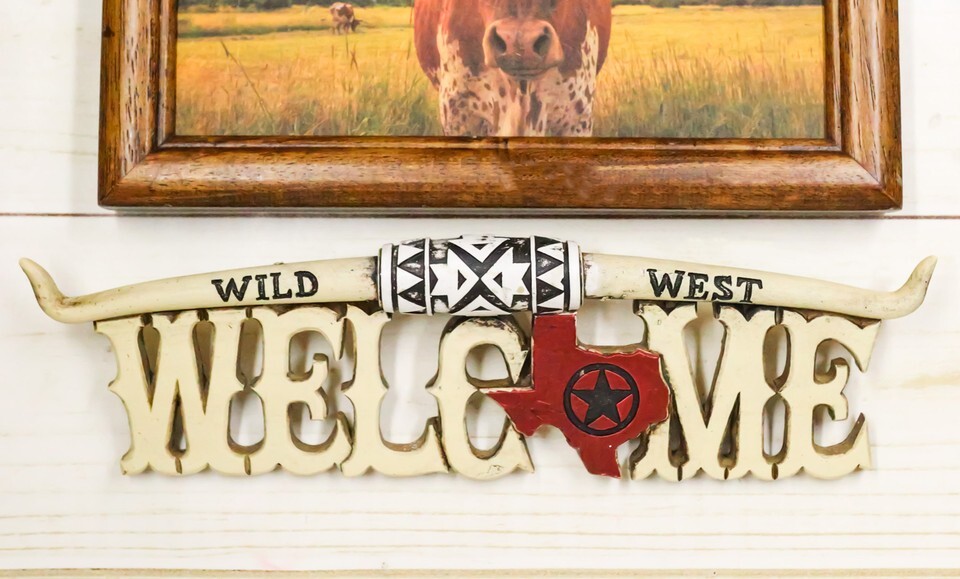 ? Bring a bold, Southwestern touch to your home with the Wild West Texas Longhorn Welcome Wall Decor. Featuring a striking Texas Longhorn steer horns, this rustic piece embodies the rugged spirit of the Lone Star State. The detailed design is accented by the iconic Texas Lone Star State Map symbol, making it a perfect addition to any Texas-themed decor or Western-inspired space.
