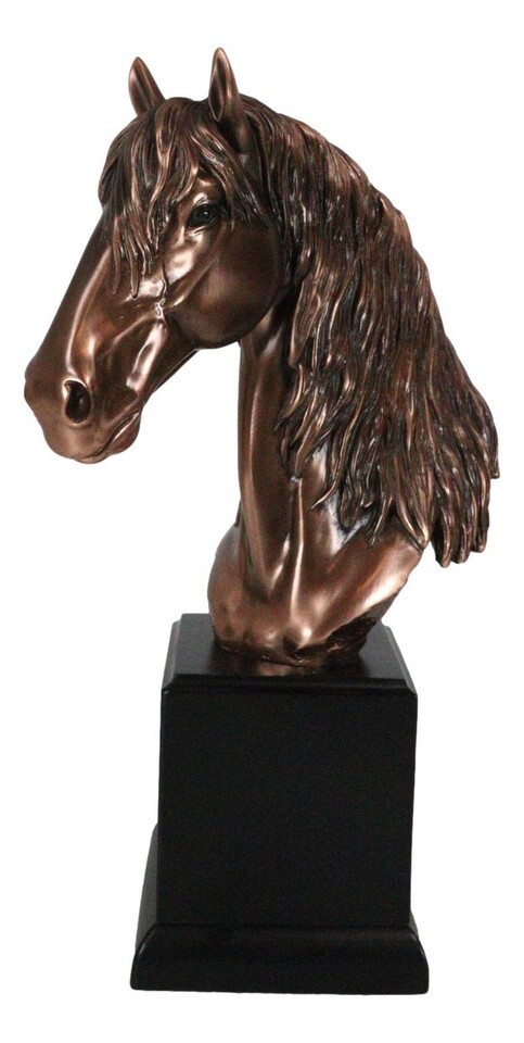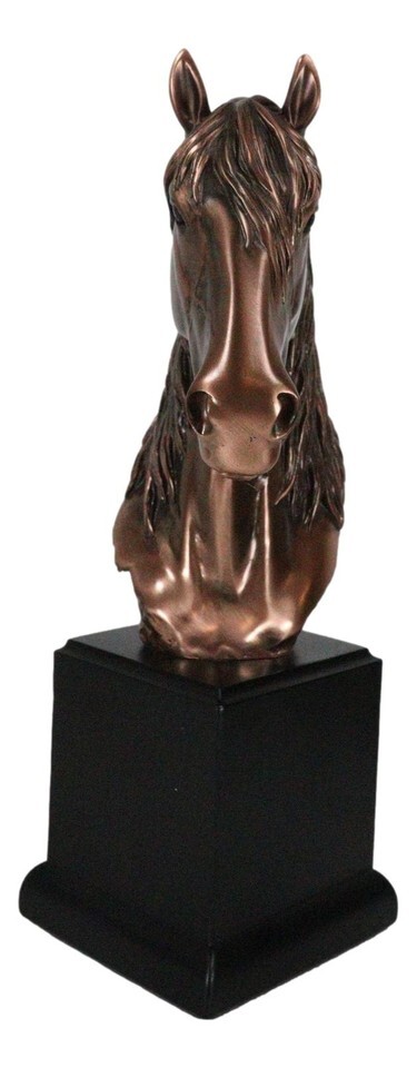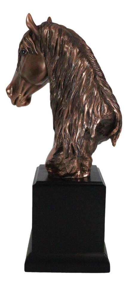 ? This Beautiful Horse Head Bust Sculpture is made of the highest quality resin, undergoing the process of bronze electroplating giving it a uniform shine on the inside as well as the surface of the figurine. To add sculptural aesthetics and display worthiness, we add accent faux black wooden base to the sculpture.