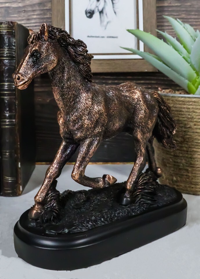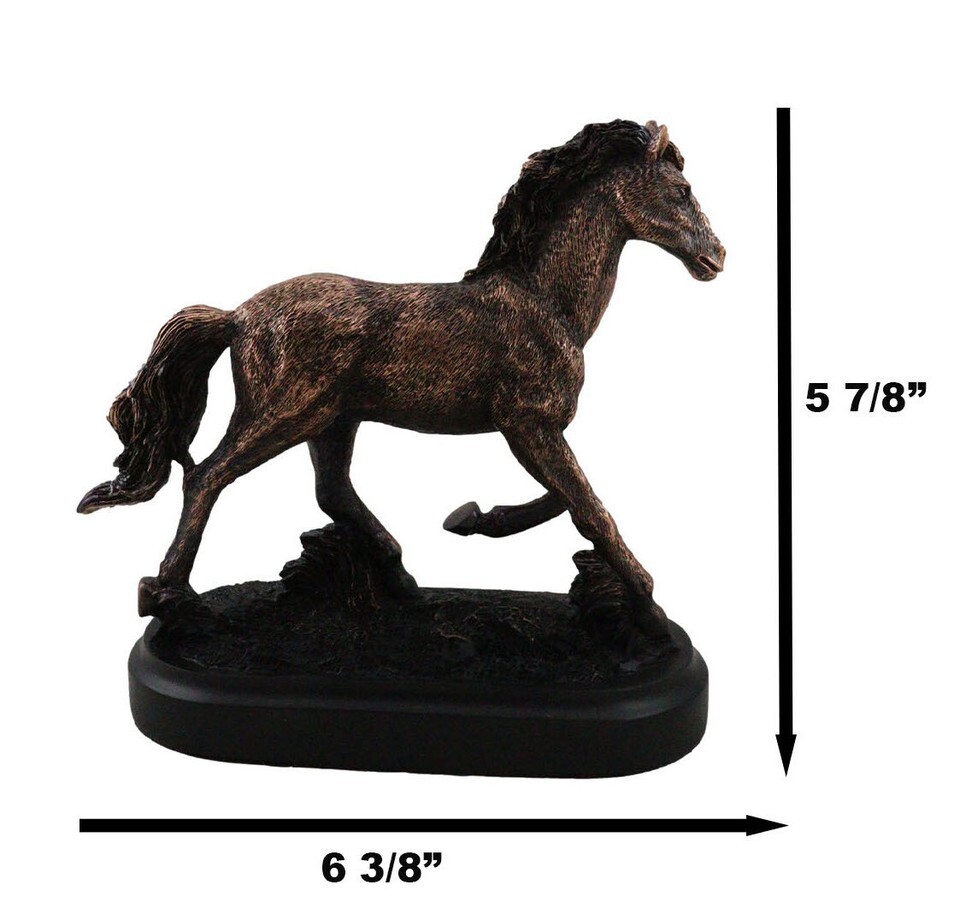 ? This Equestrian Horse Figurine is made of the highest quality resin, undergoing the process of bronze electroplating giving it a uniform shine on the inside as well as the surface of the figurine. To add sculptural aesthetics and display worthiness, we add accent faux black wooden base to the sculpture.