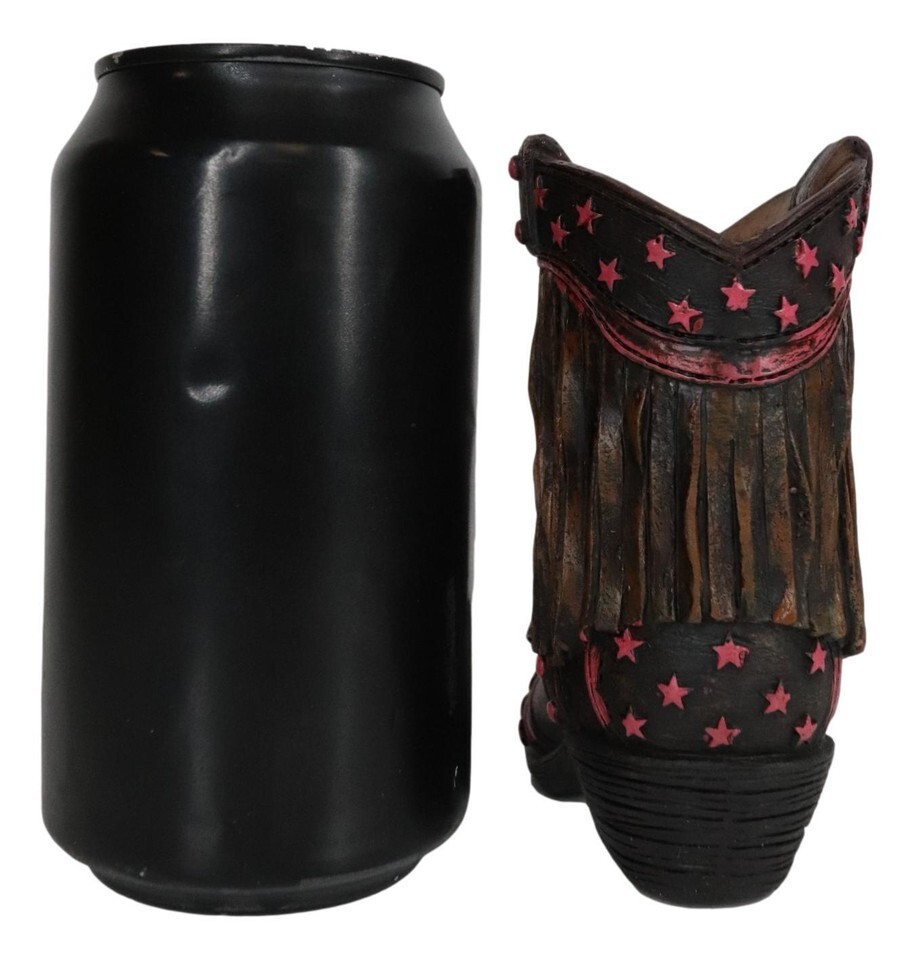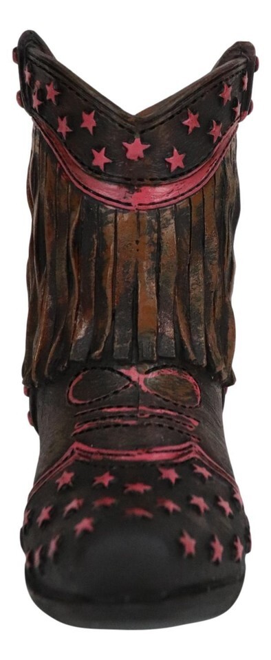 ? Spice up your decor with this patriotic cowboy boot accent sculpture. This boot does double duty as a pen/stationery or makeup brushes/tools holder as well as an attractive accent piece. Intricately hand crafted and painted in multi colors, the boot is detailed with sculpted fringes, pink stars and more! The tooled leather finishing makes the sculpture look like a real leather boot from a distance!