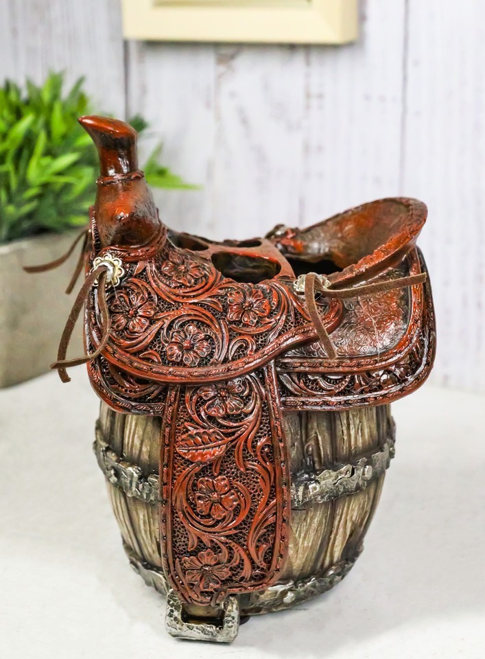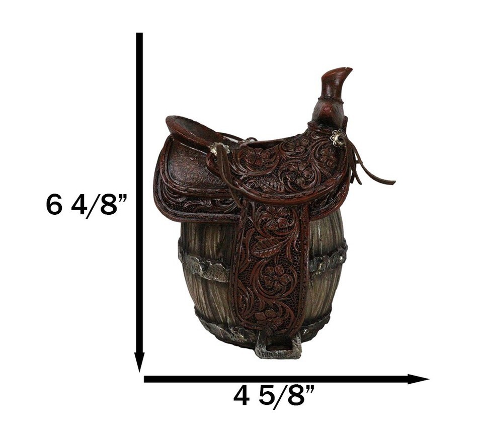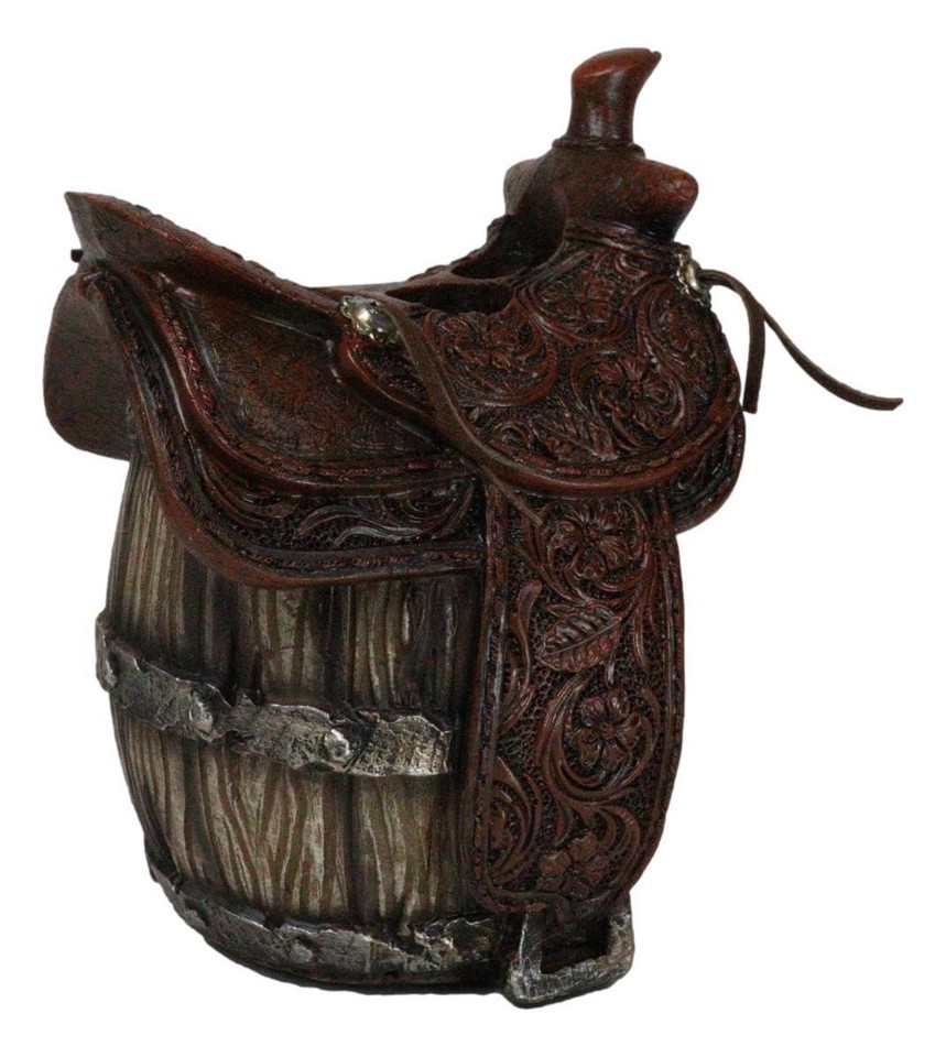 ? Introducing our Rustic Western Cowboy Horse Saddle On Wooden Barrel Toothbrush and Toothpaste Holder Figurine! This unique piece combines functionality with Western charm, featuring a beautifully crafted faux tooled leather saddle resting on a rustic wooden barrel. Perfect for adding a touch of cowboy spirit to your bathroom, this holder not only keeps your toothbrush and toothpaste organized but also serves as a charming decorative accent.