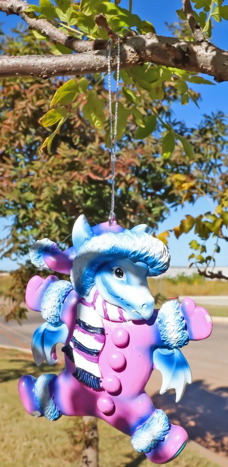 ? This Holiday Dragon ornament sculpture is made of polyresin, hand painted and polished individually. The sculpture is equipped with a hanging string that hangs dwon about 3"-4".