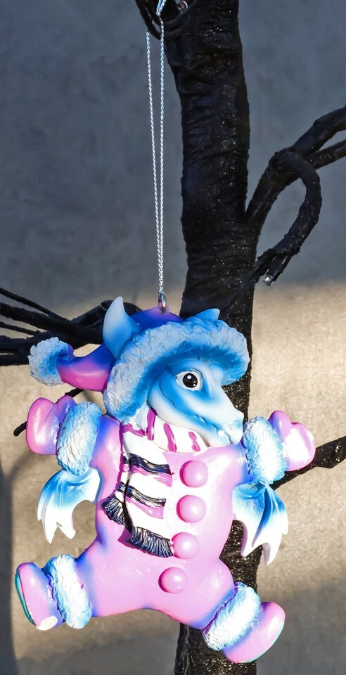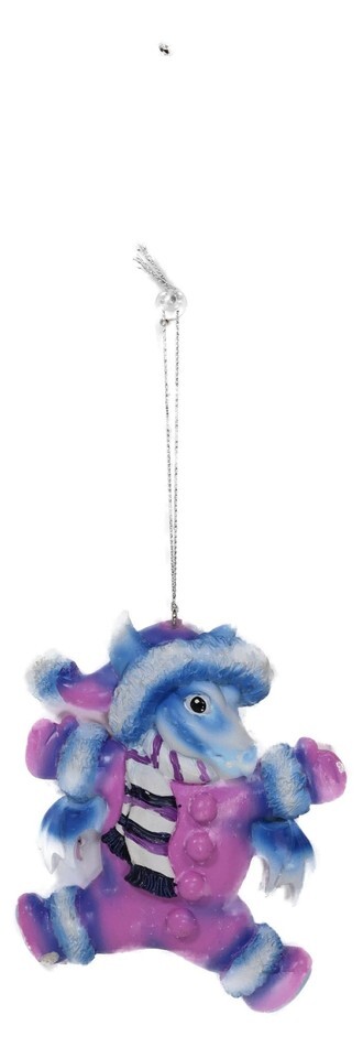 ? Gotta keep warm in winter, and this little dragon knows how to do it! The ornament shows off a cute blue dragon all decked out in a purple snowsuit, complete with fluffy sleeves, hat, and a striped scarf! The decoration makes a unique Christmas gift, and will look adorable hung on a tree.