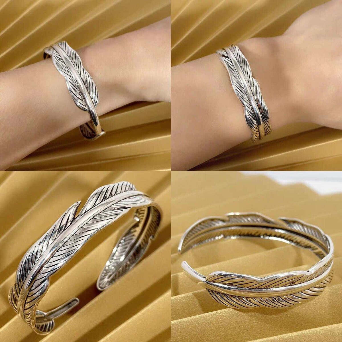 S9999 Silver Filled Vermeil Feather Cuff Bangle | Thai Vintage Trend | Unisex Adjustable Bracelet | Gift Jewelry SL337