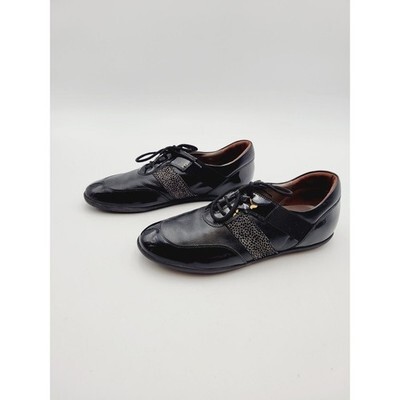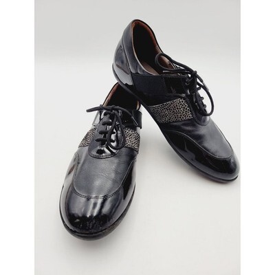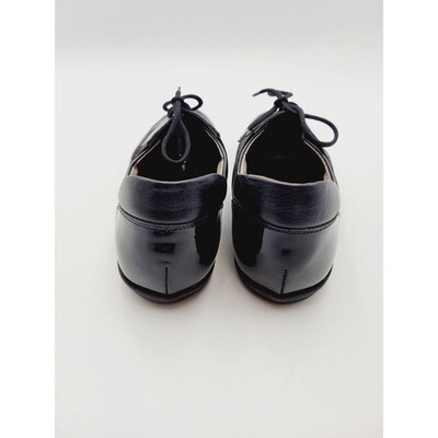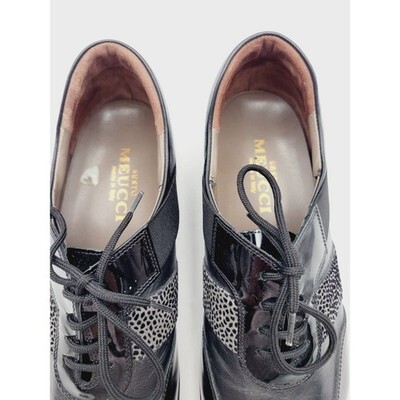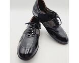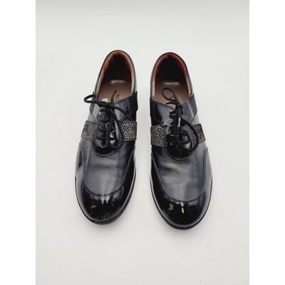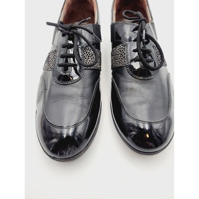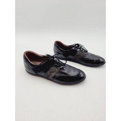 These Sesto Meucci Oxfords are crafted in Italy from black nubuck suede, featuring a solid pattern with a round toe shape and lace-up closure. With a moderate cushioning level and cushioned features, these flats provide comfort for casual occasions. Made for women in US size 7 (EU size 37.5), the handmade shoes offer a classic style suitable for year-round wear.