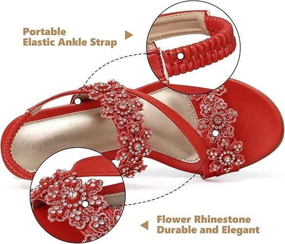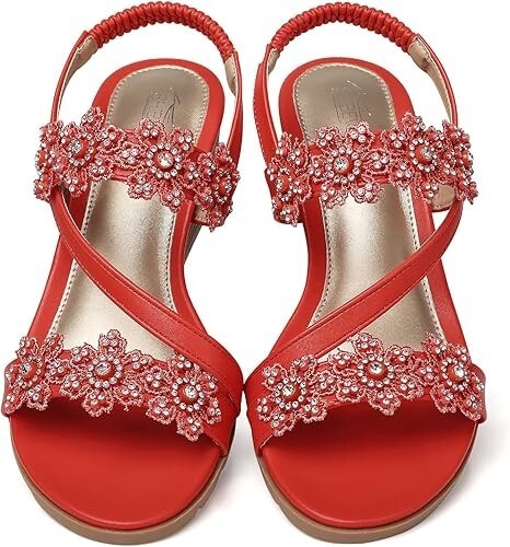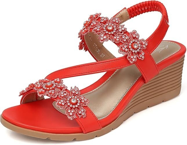 \SHIBEVER Womens Sandals Wedge Flower: Open Toe Elastic Ankle Strap Wedge Sandal - Dressy Sandals Women - Comfortable Summer Bohemia Red VT1605 EU42 US size 10