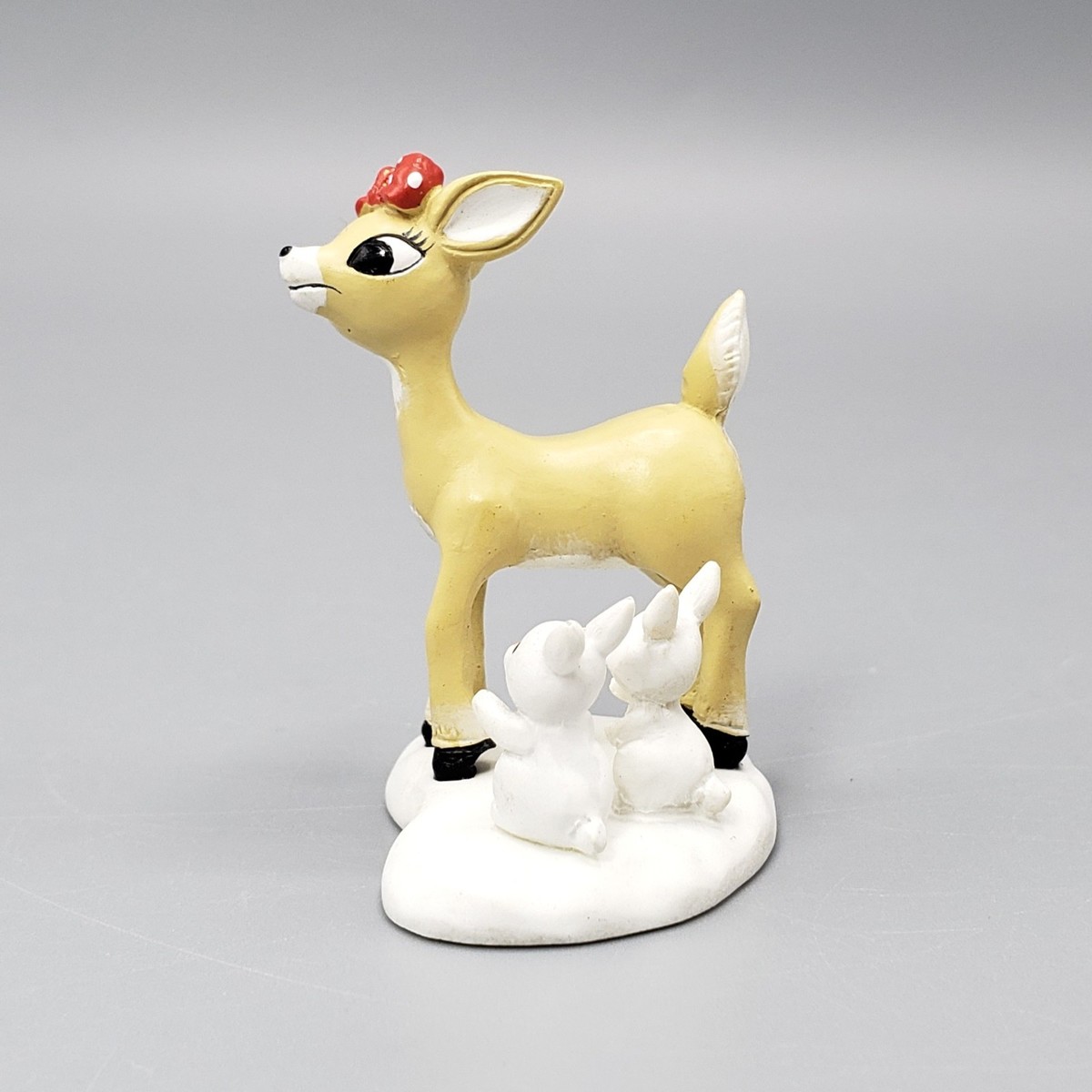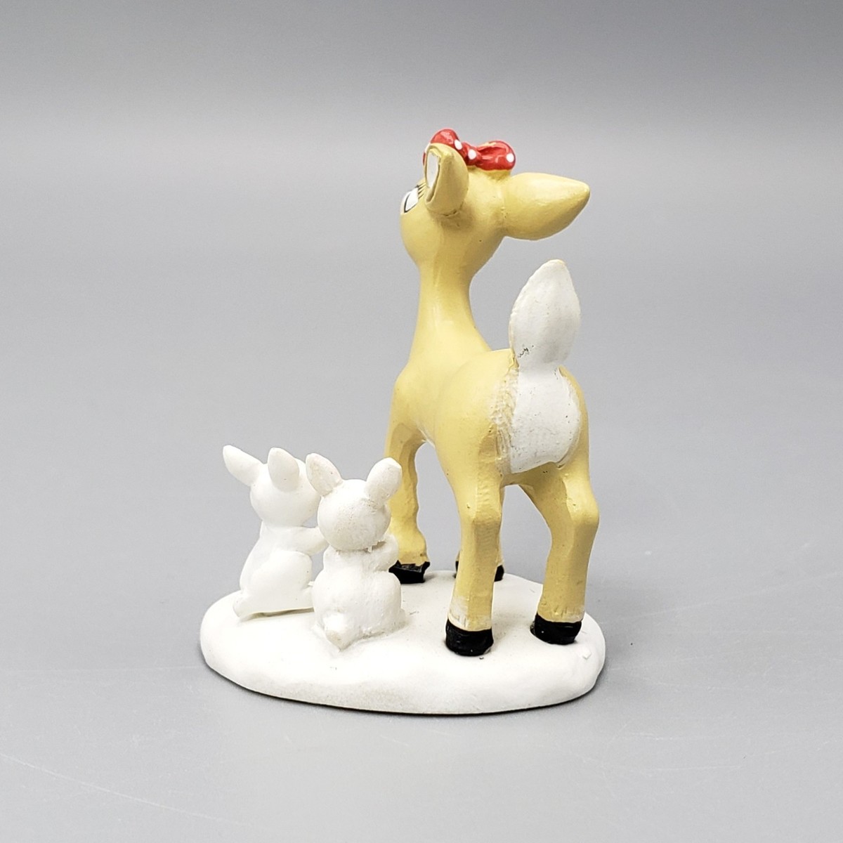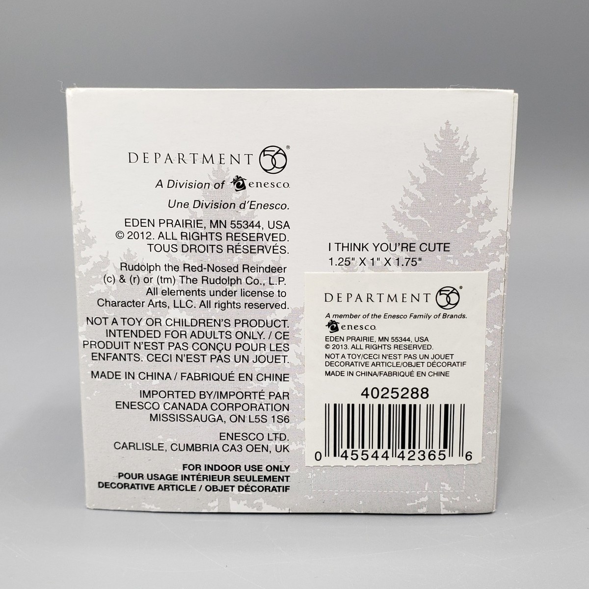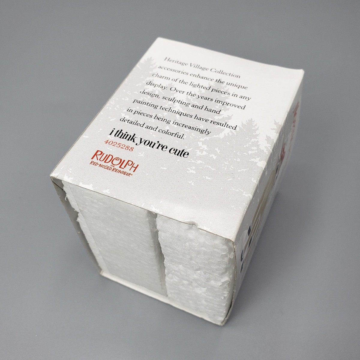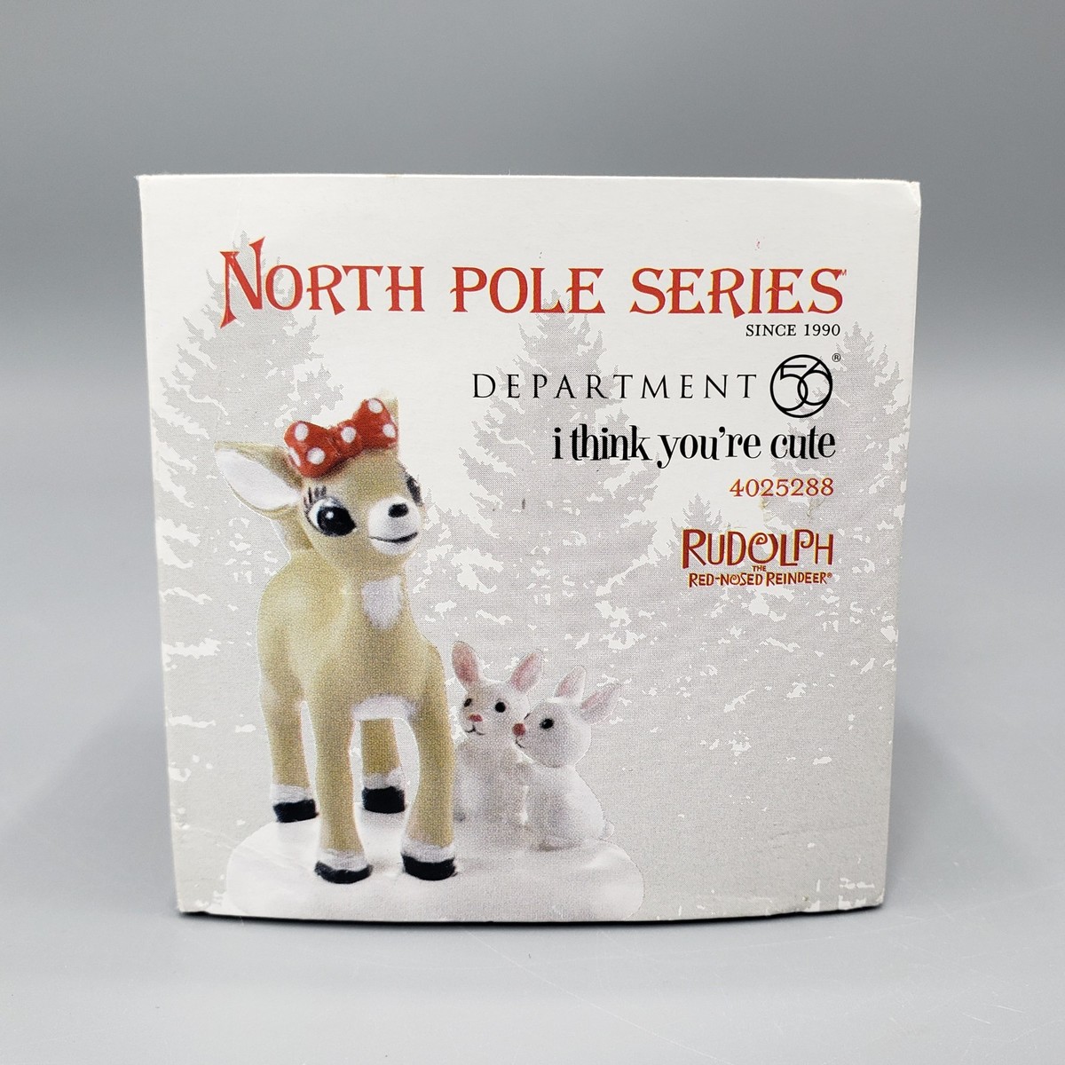 Department 56 accessory figure #4025288 from the Rudolph the Red-Nosed Reindeer collection of the North Pole series. This figurine is named I THINK YOU'RE CUTE and features Clarice with two white rabbits standing next to her. It was manufactured in 2013 and SIGNED on the bottom by Thomas Bates, who has been a designer at Dept 56 for more than 25 years. Made of plastic, it measures approximately 1-3/4" tall.