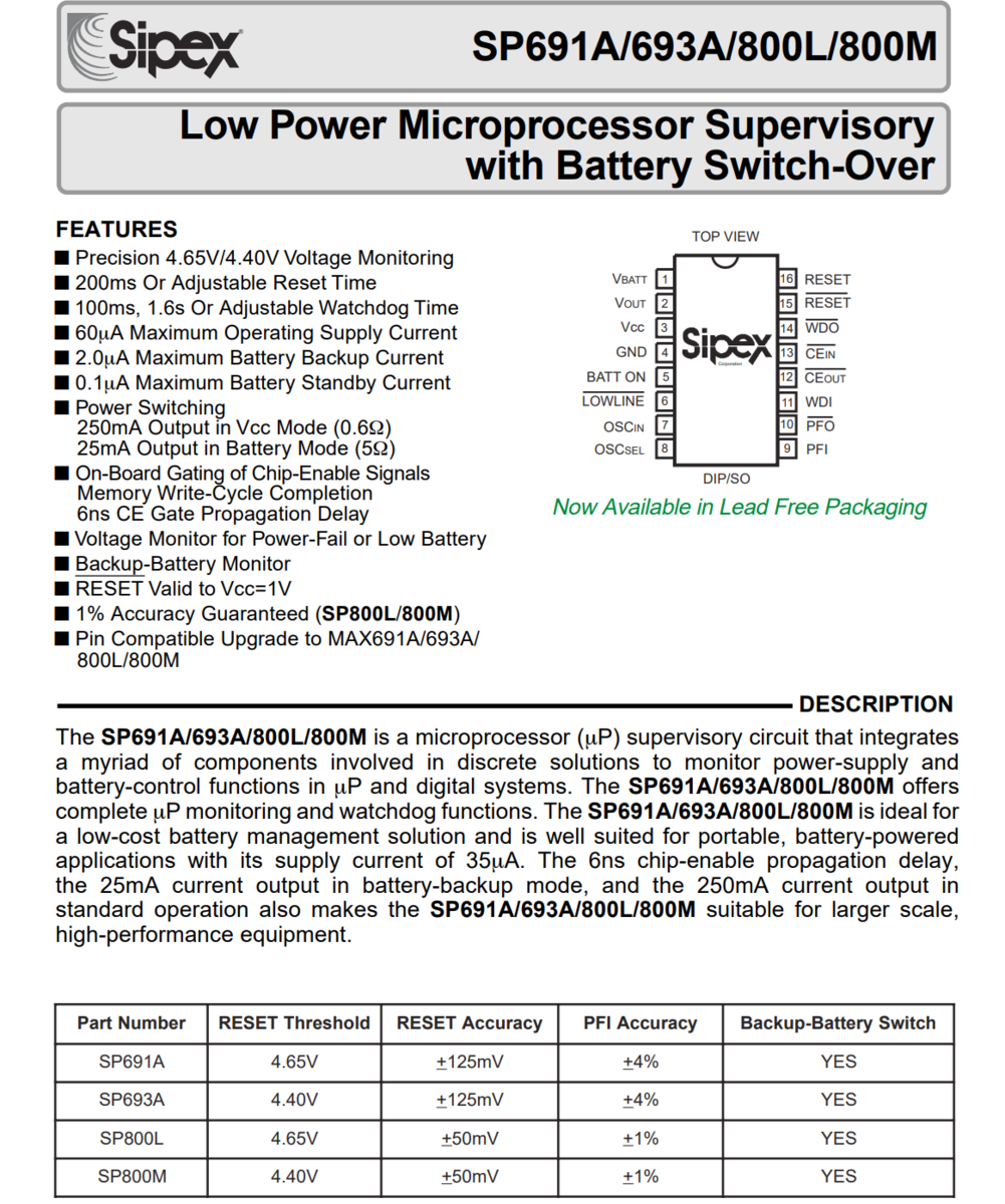 - SP691ACP SIPEX Microprocessor Supervisor with Battery Switch Over DIP-16