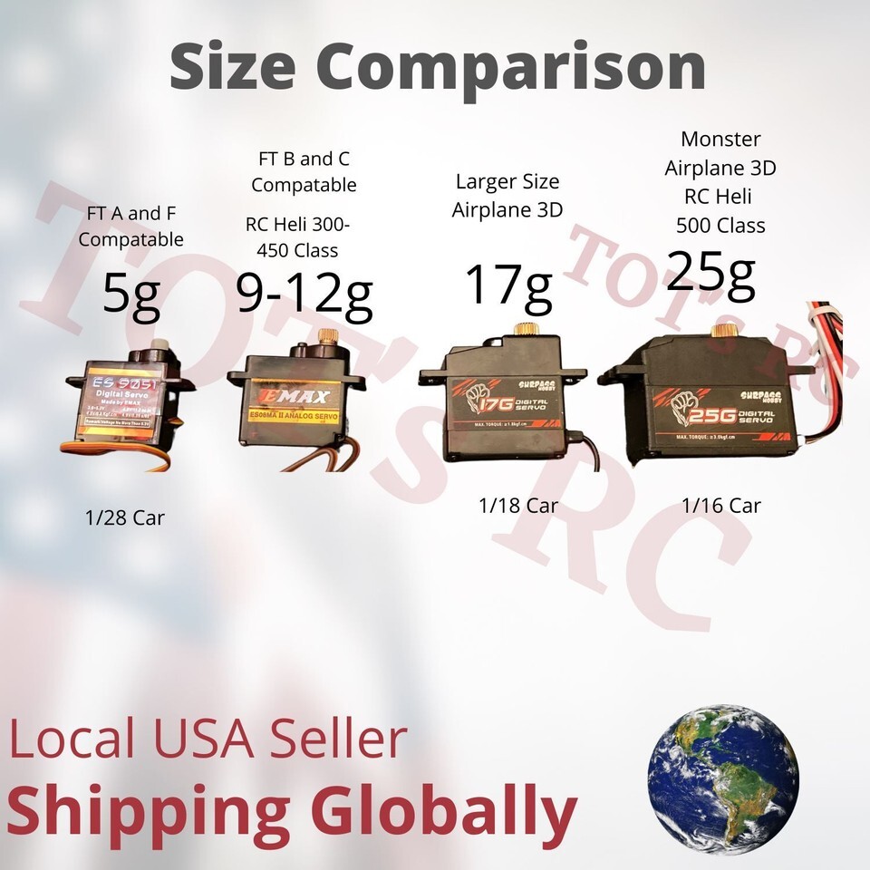 Welcome to ToT's RC, A Family Business Located in Phoenix, Arizona. Here is Our Newest offering, Surpass Hobby 9 gram all metal gear Digital Servo. A new Standard of Price and Performance. Great for RC Helicopters 300-450 scale, RC Boats, RC Planes, fixed Wing, FPV, Gliders, Robotics, Equivalent upgrade servos for Flite Test B and C pack Nylon Servos, and many other uses. The Metal gears give this servo, much more durability and strength, great for new RC Pilots and Drivers and great for the experienced Pilot who wants Higher Quality Components.