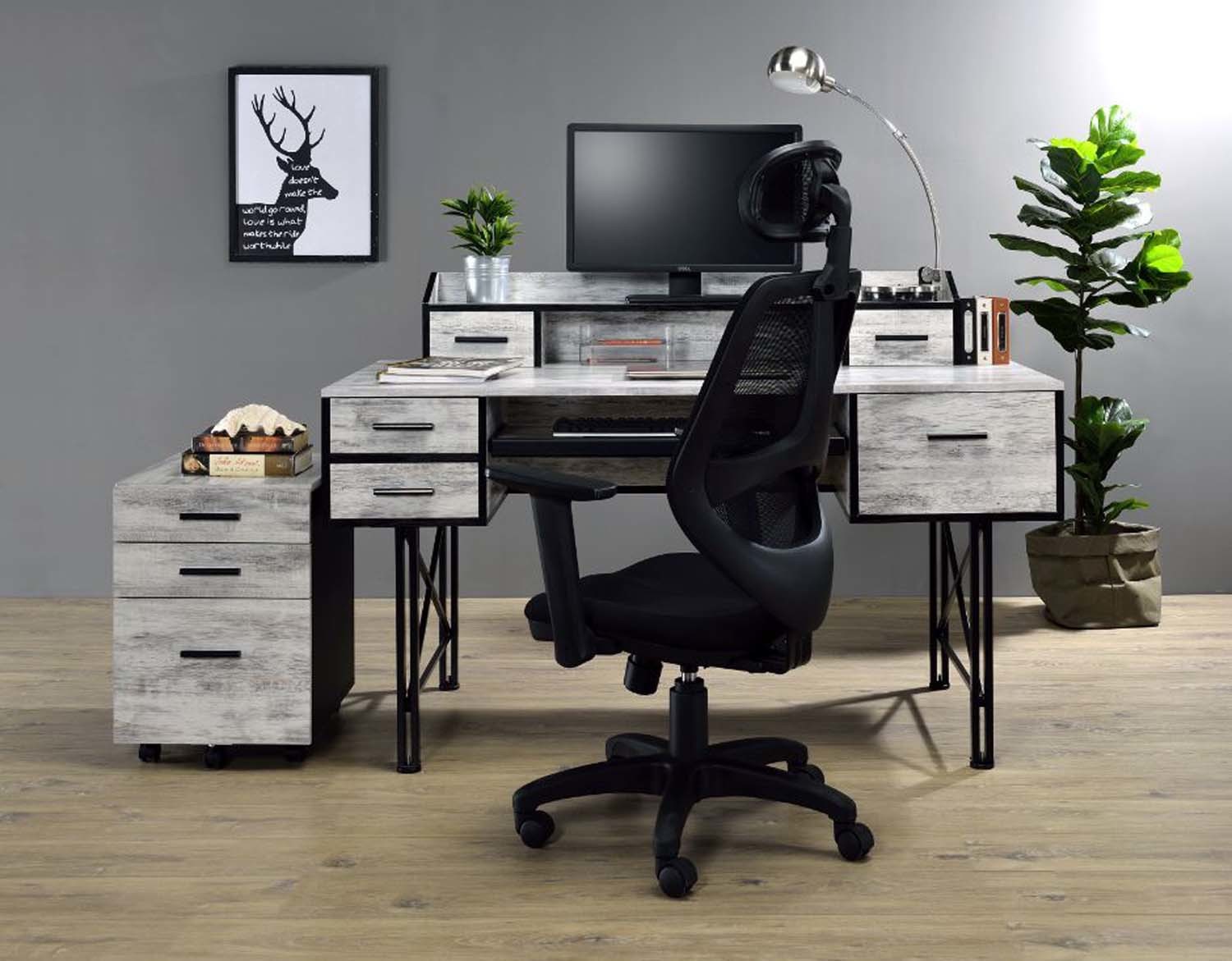 Highlighting a bold, stunning and gorgeous mix, the Safea Desk features rustic casegood paired with a double pedestal metal base for a interesting contrast. Above the desk, there is a low open hutch with two small drawers that allows you place a computer screen and organize office suppies. Under the desk top, two shallow drawers and one deep drawer for documents or other files in different size while a keyboard tray for your computer equipments. What is even more surprising is that the back of the desk is designed to provides extra display area for your collection.