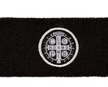 Your purchase is for a very nice black thick sports headband with the medal of Saint Benedict on it. It comes with a very nice 100% polyester, terry cloth. It measures 7" and 2 1/2" wide.
