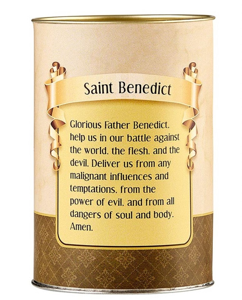 Measurements: 3.50" x 2.3/8" diam. It's made of fire retardant coated paper tin. It comes with a tin top and bottom. It comes with a prayer to Saint Benedict, that reads as follows: "Glorious Father Benedict, help us in our battle against the world, the flesh, and the devil. Deliver us from any malignant influences and temptations, from the power of evil, and from all dangers of soul and body. Amen."